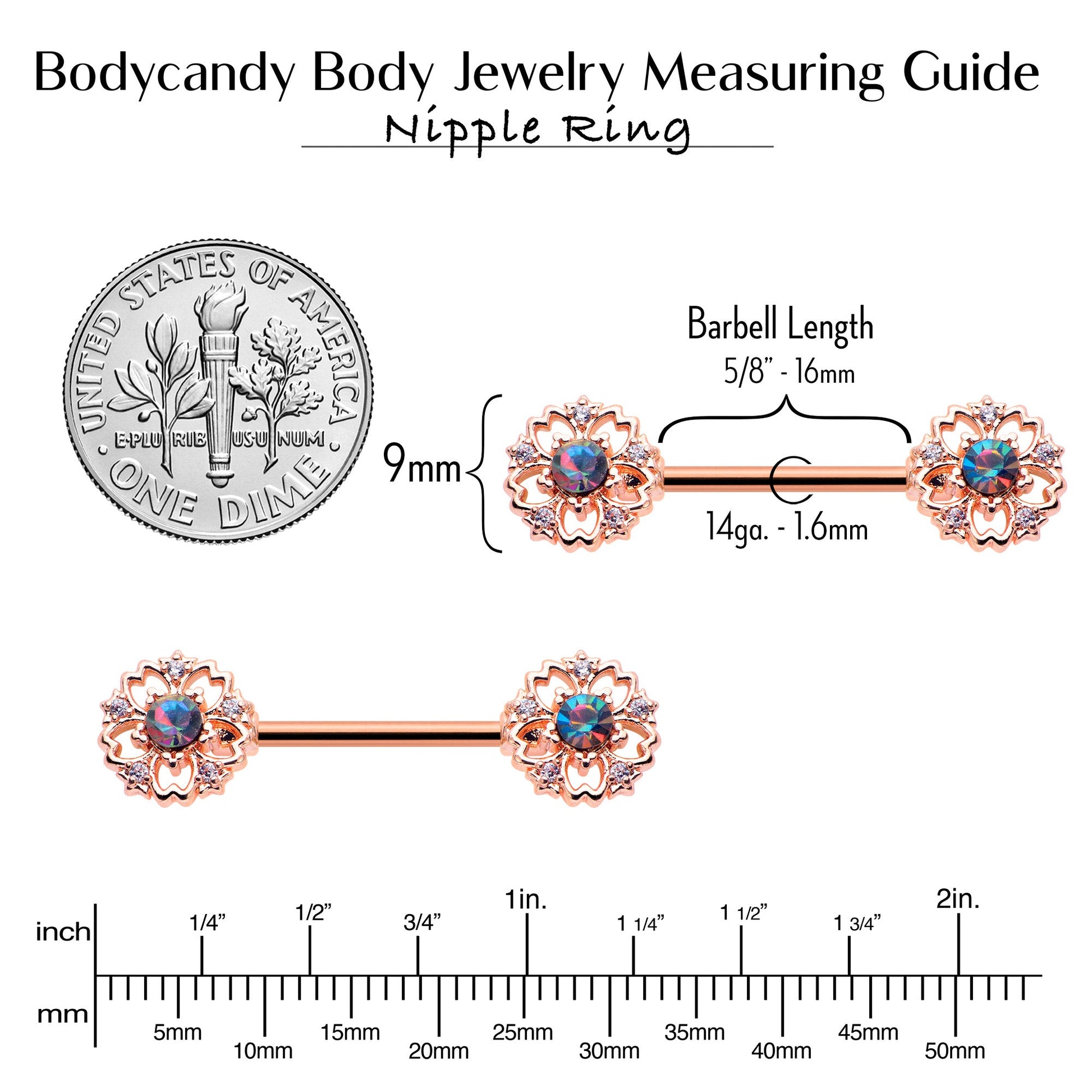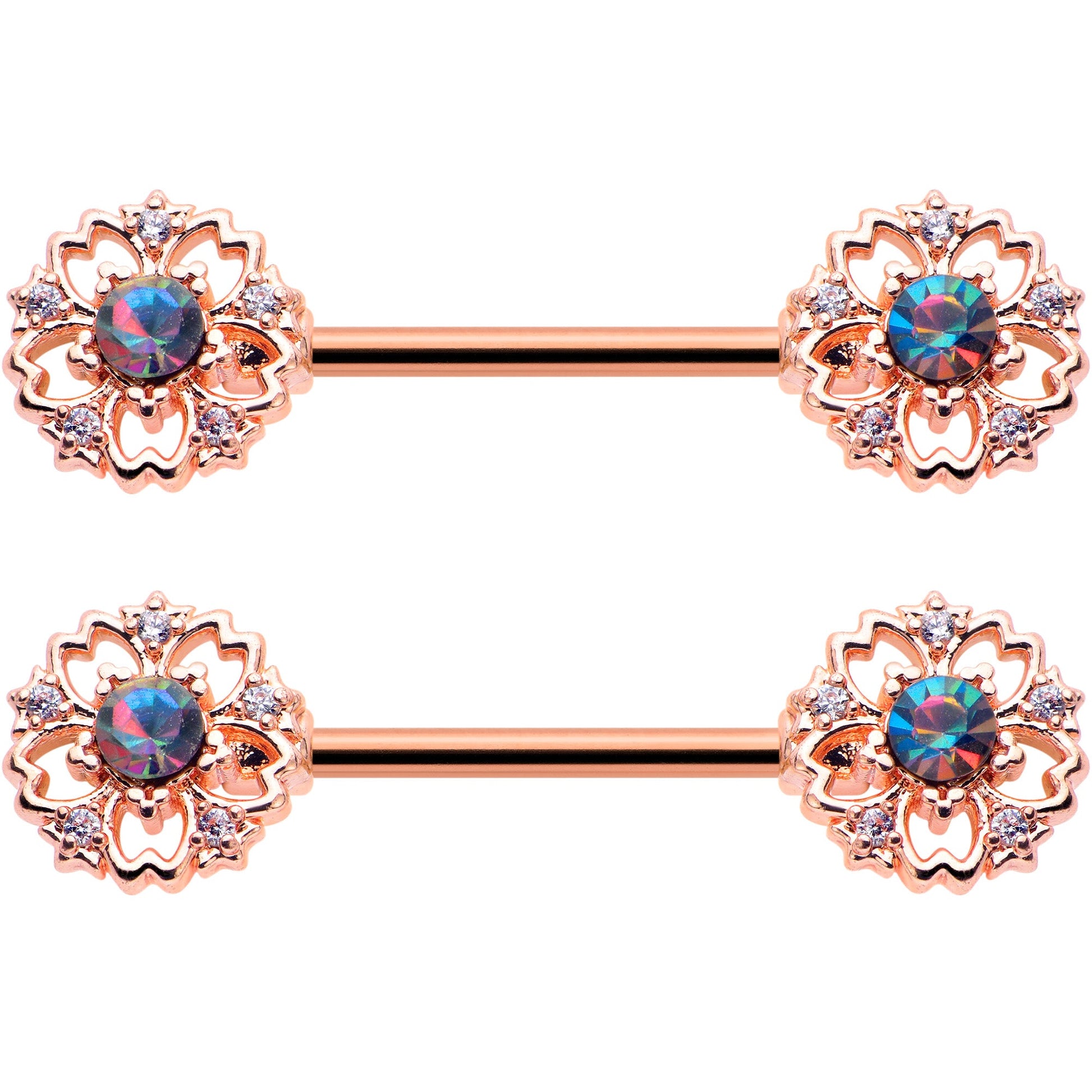 The elegant floral design on this 14 gauge nipple jewelry is absolutely eye catching. It is made with 14mm rose gold tone PVD over 316L surgical grade stainless steel straight barbells. Each of the ends features a flower charm with a vitrail gem center. They are further embellished with clear gems along the edge for added style. You are sure to feel gorgeous when you are rocking these elegant, floral nipple piercing rings. Sold as a set of two.