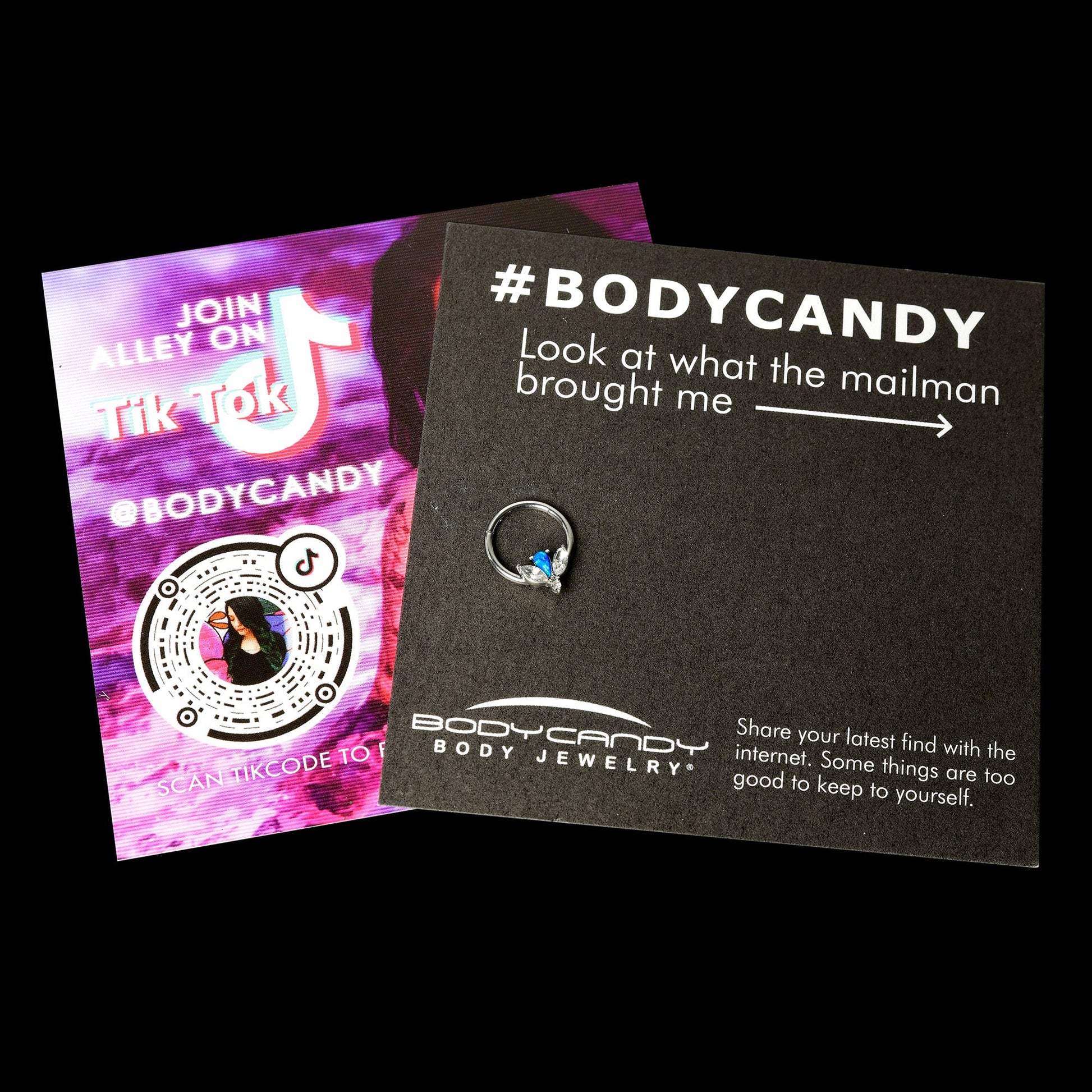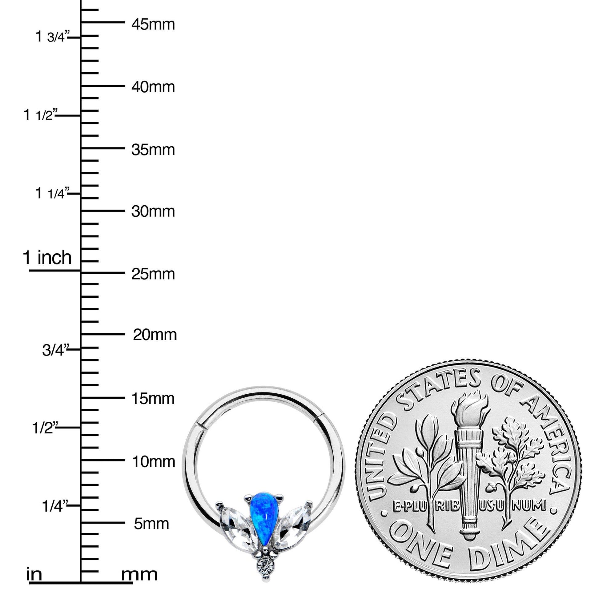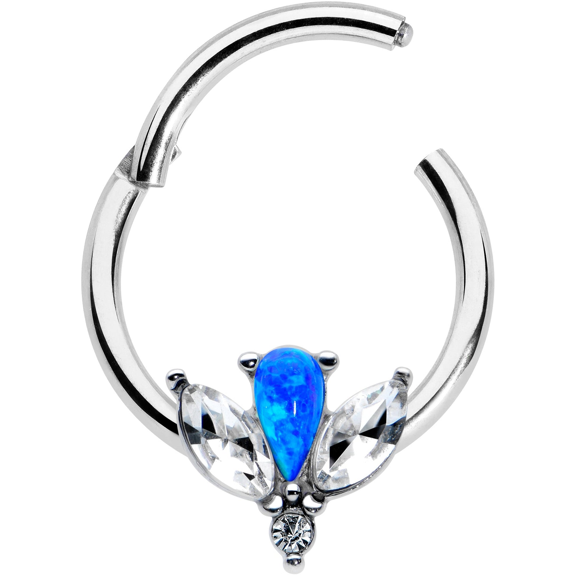 With lovely color and style, you can't help but love this 16 gauge septum ring! It's made with a 10mm durable 316L surgical grade stainless steel hinged circular ring. It features a flower charm, the leaves set with small clear gems and the blossom composed of a blue faux opal. It also features a non-removable, hinged segment that makes insertion and removal a breeze and you can rock it in multiple piercings including tragus, helix, and some daith piercings. Keep it simple while keeping it stylish with this fabulous flower cartilage piercing ring!