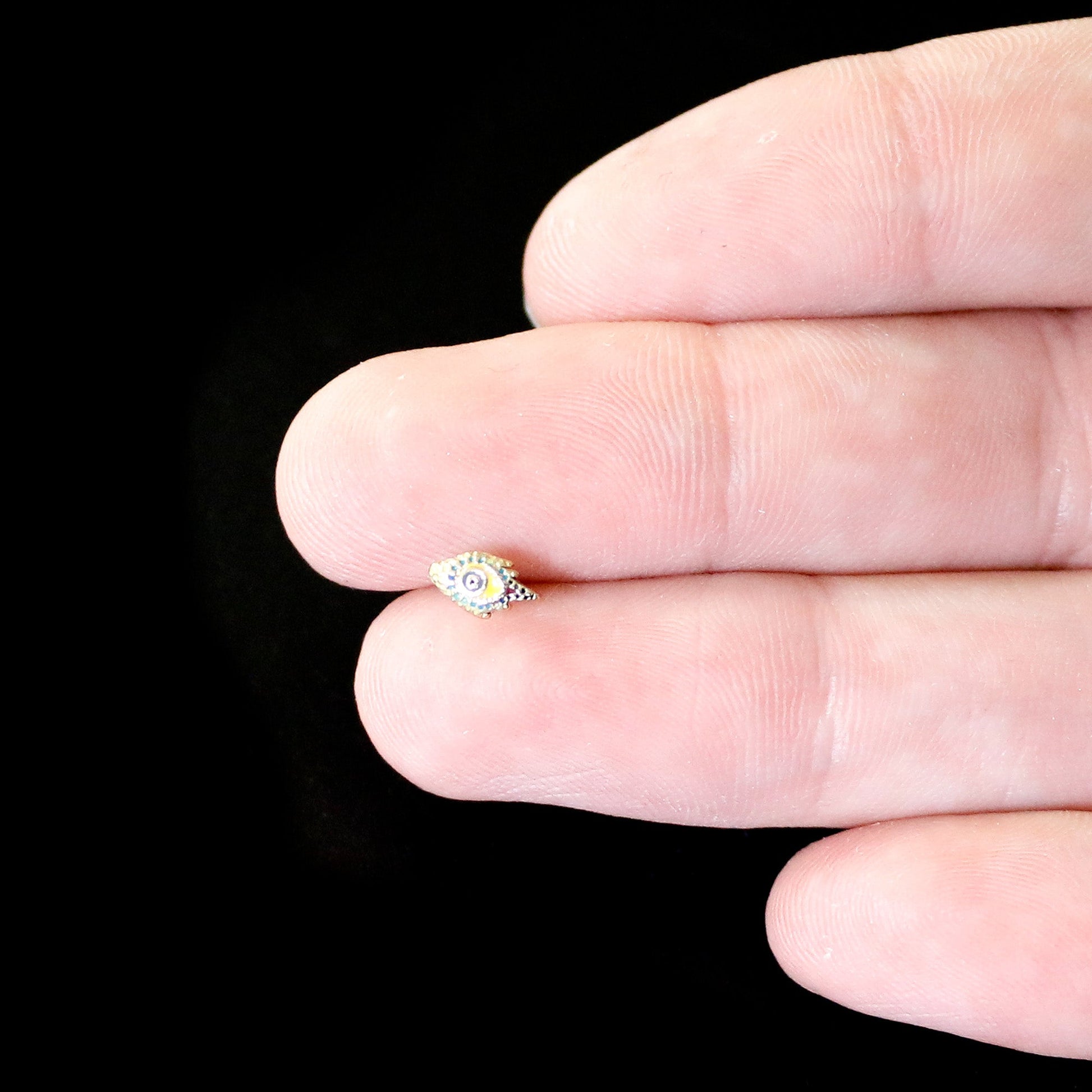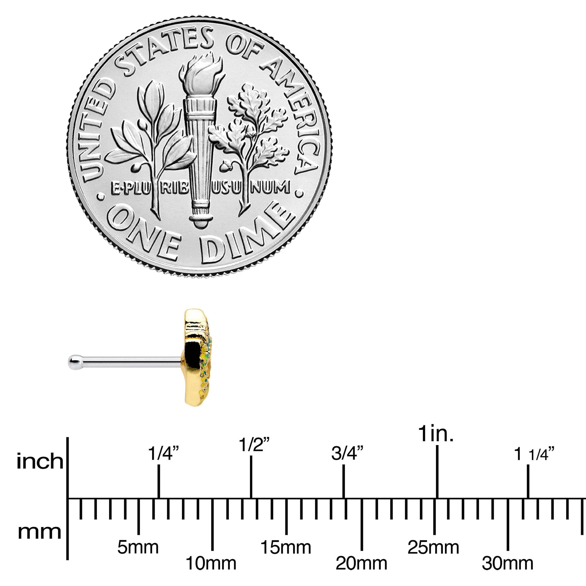 The feather left behind on this 20 gauge nostril ring came from one bold bird! It's made with a 6mm durable 316L surgical grade stainless steel straight post. It features a peacock feather charm, in bright shades of green and yellow. The central portion of the feather features blue embellishment for a truly eye-catching look. You'll want to preen like a pretty peacock when you're rocking this fabulous feather nose piercing jewelry!