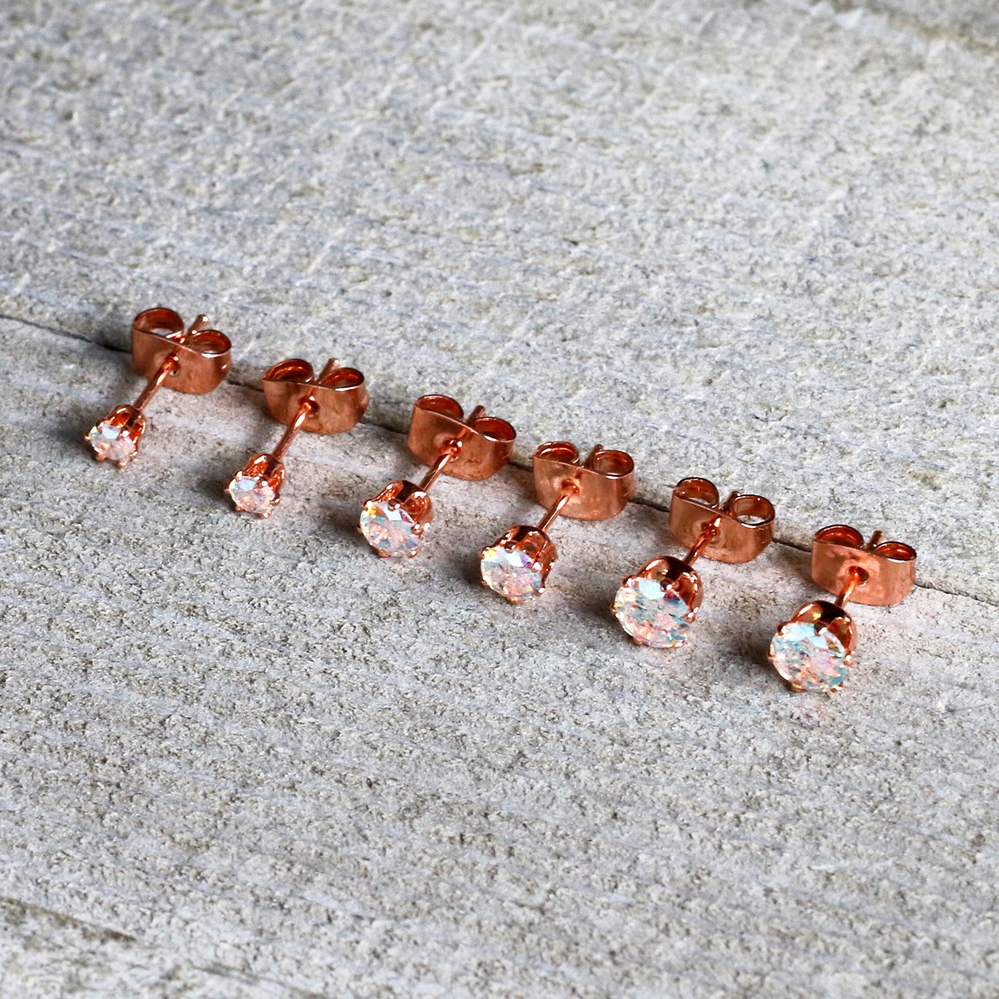 If you're looking for classic style that goes with everything, these 20 gauge earrings will have you ready for any occasion. They're made with rose gold tone plated over stainless steel straight posts and have butterfly-style friction backs for a secure fit. They feature single aurora cubic zirconia gems. You get one pair each in 3mm, 4mm, and 5mm - a touch of classic chic to go with every look. These are sure to add some simple elegance to your pierced lobes. Sold as a set of six.