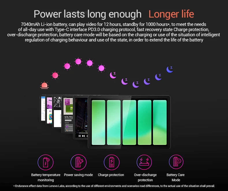 7040mAh Li-ion battery, can play video for 12 hours, standby for 1000 hours*, to meet the needs