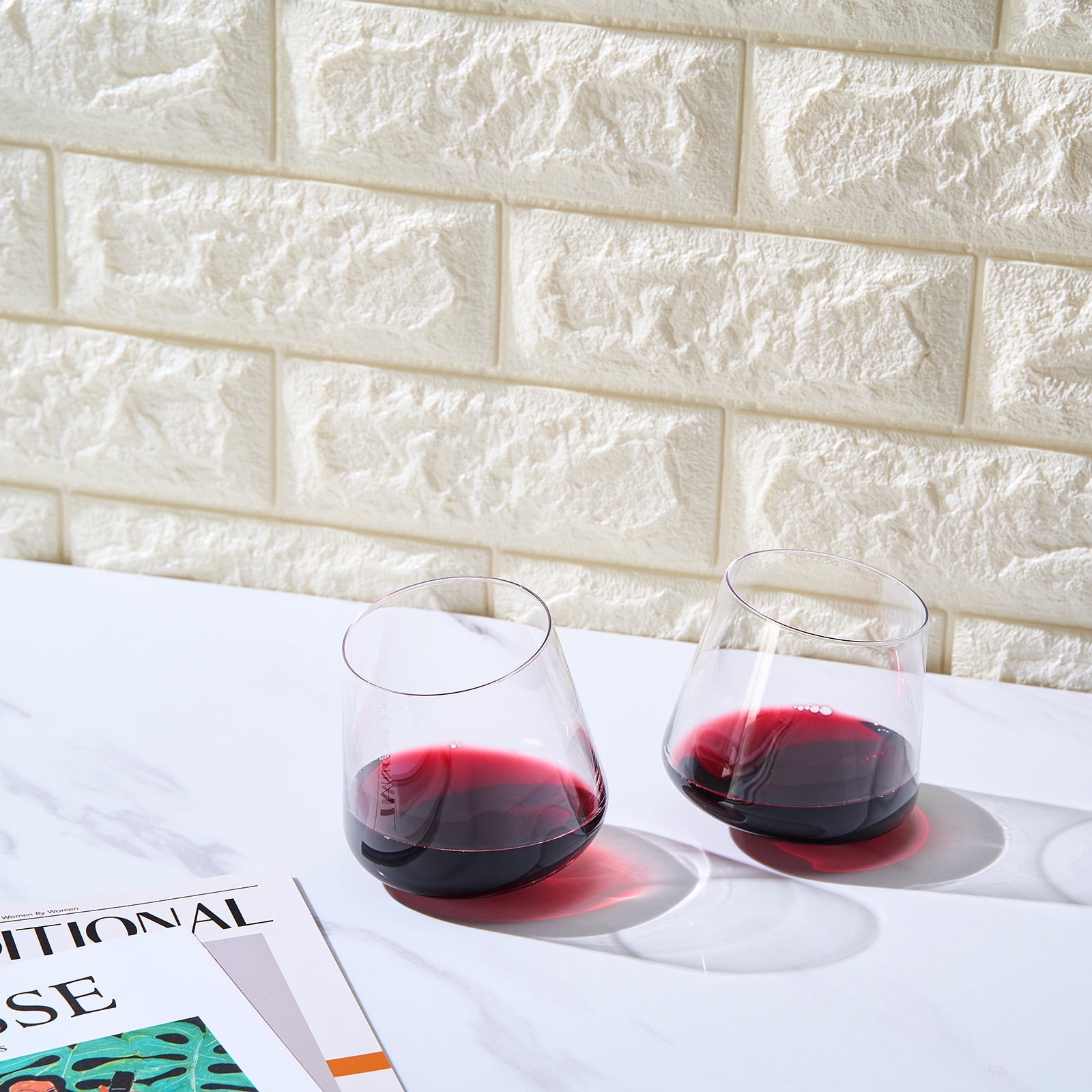 - Crafted with precision and attention to detail, these wine glasses feature a unique design that sets them apart from traditional glassware. The titled bottoms of the glasses act as stabilizers, ensuring that they will never fall over and spill, even on uneven surfaces. This innovative feature not only brings peace of mind but also adds a touch of intrigue to your drinking experience.