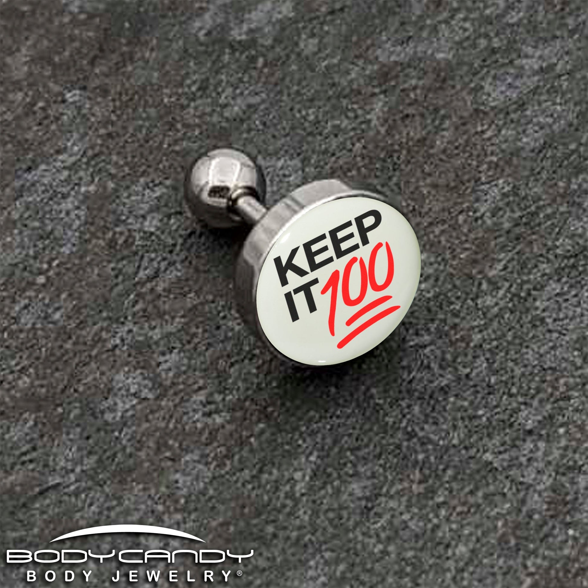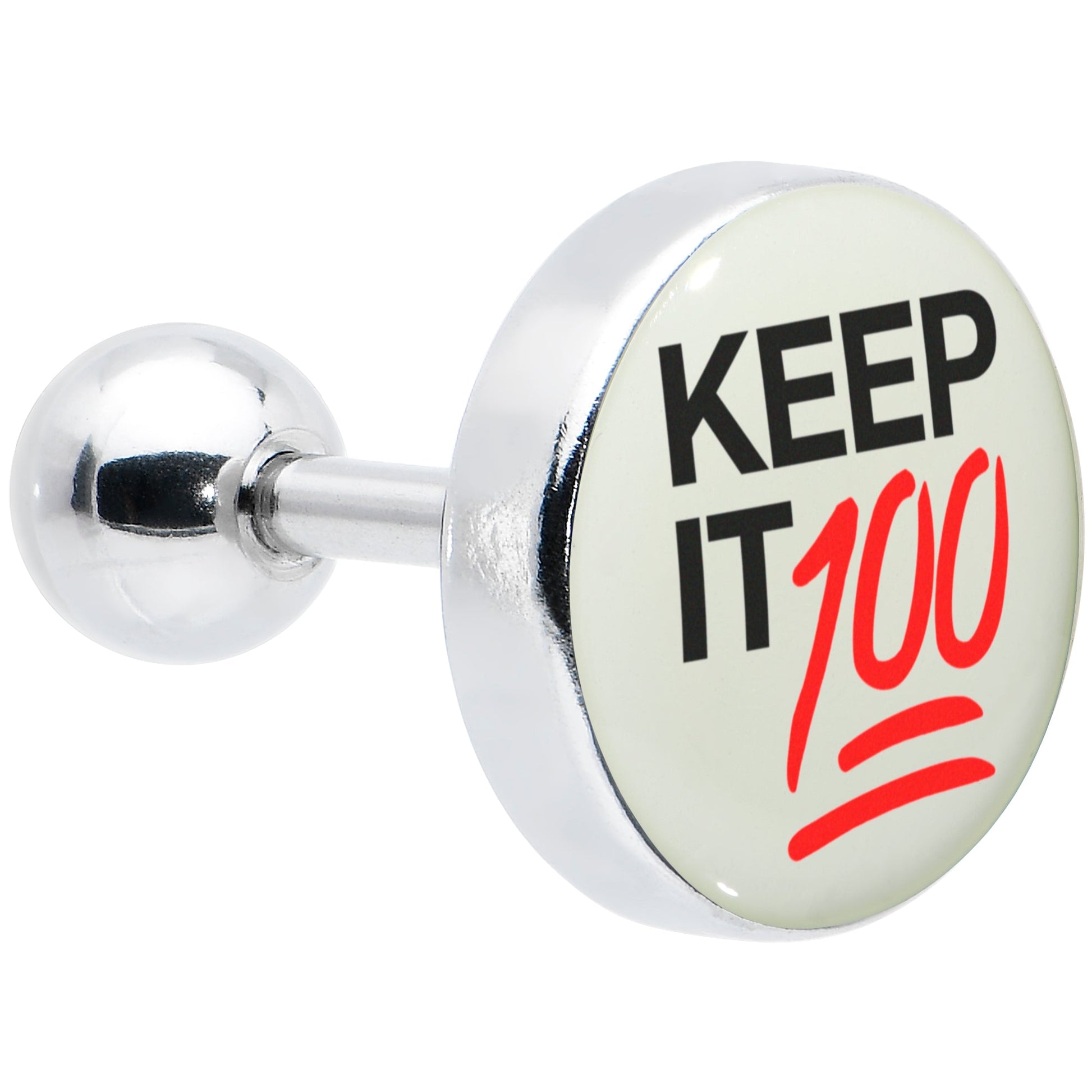 If you want everything maxed out, even with the lights out, get ready to rock this 16 gauge tragus stud. It's made with a 6mm durable 316L surgical grade stainless steel straight barbell with a 4mm ball end. It features a white disc logo charm that says Keep It 100 with red embellishment and emoji styling. Even better, when the lights go down it glows in the dark and you can even rock it in multiple piercings including tragus, helix, and some conch piercings. You'll be keeping it 100 no matter the time of day with this glow in the dark cartilage piercing jewelry.