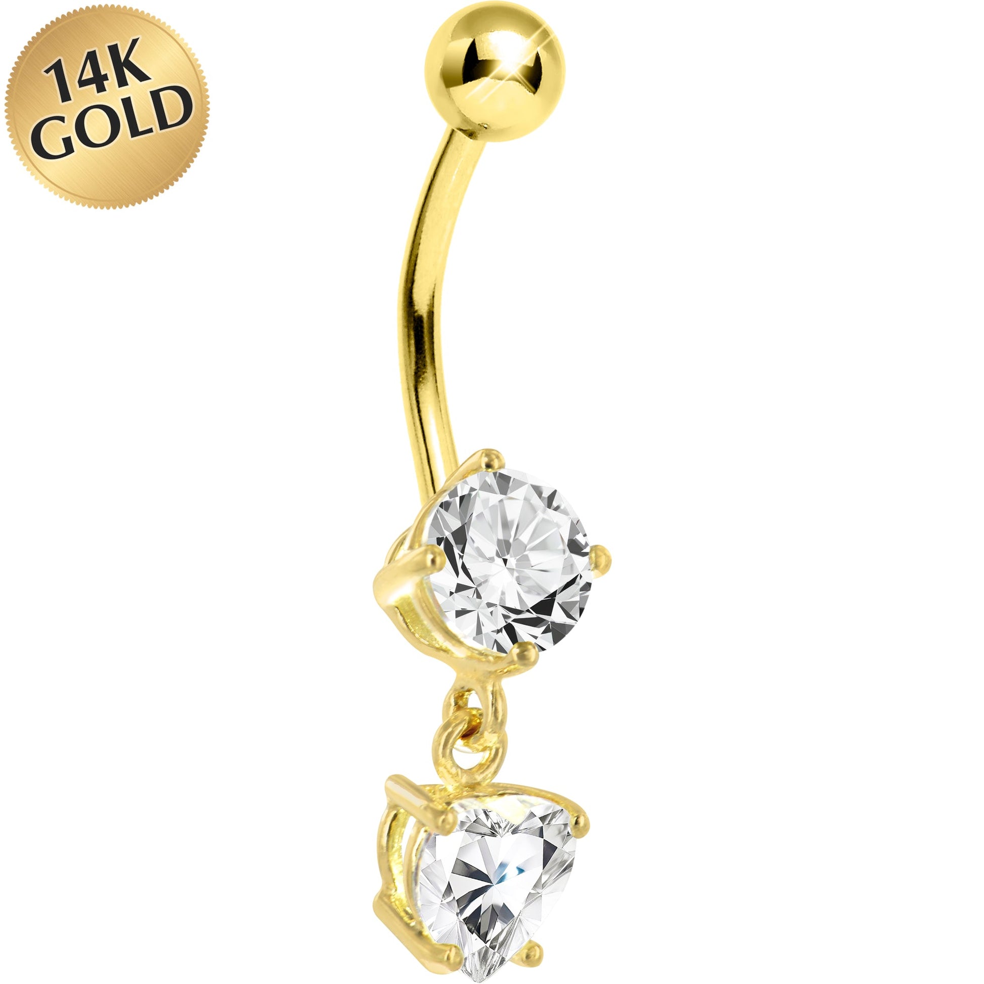 16G Solid 14k Yellow Gold Cubic Zirconia Solitaire Round Heart Dangle Belly Ring
