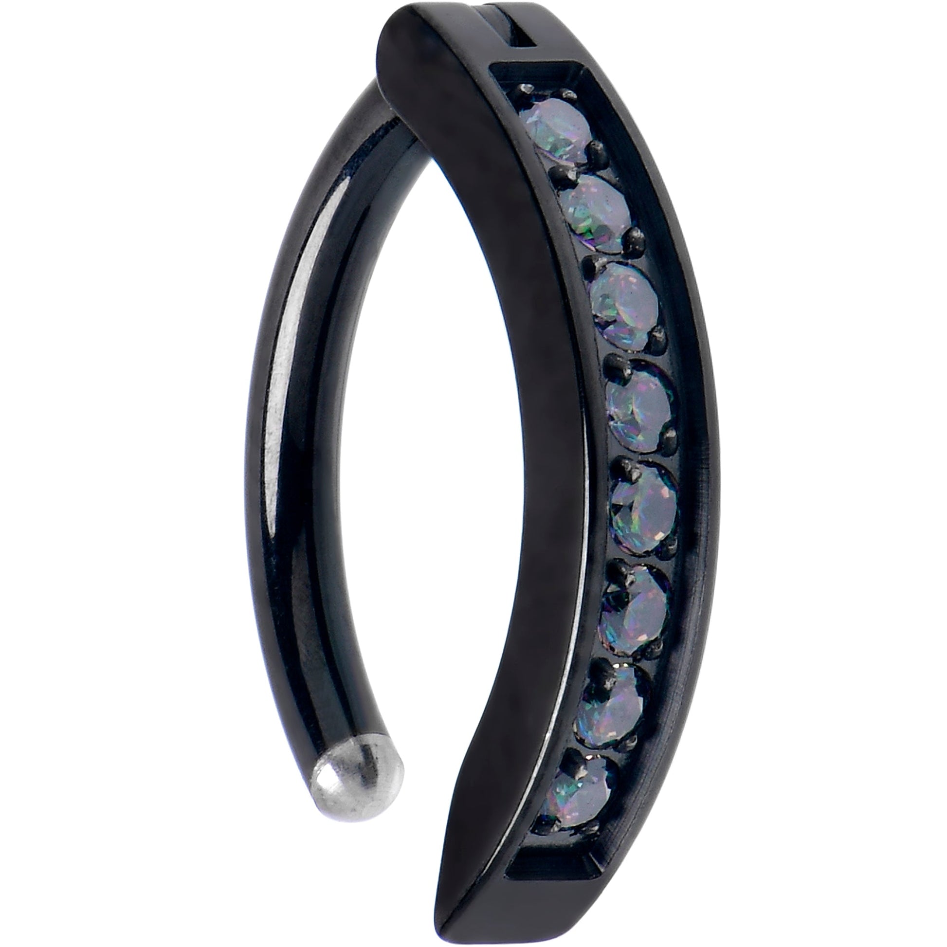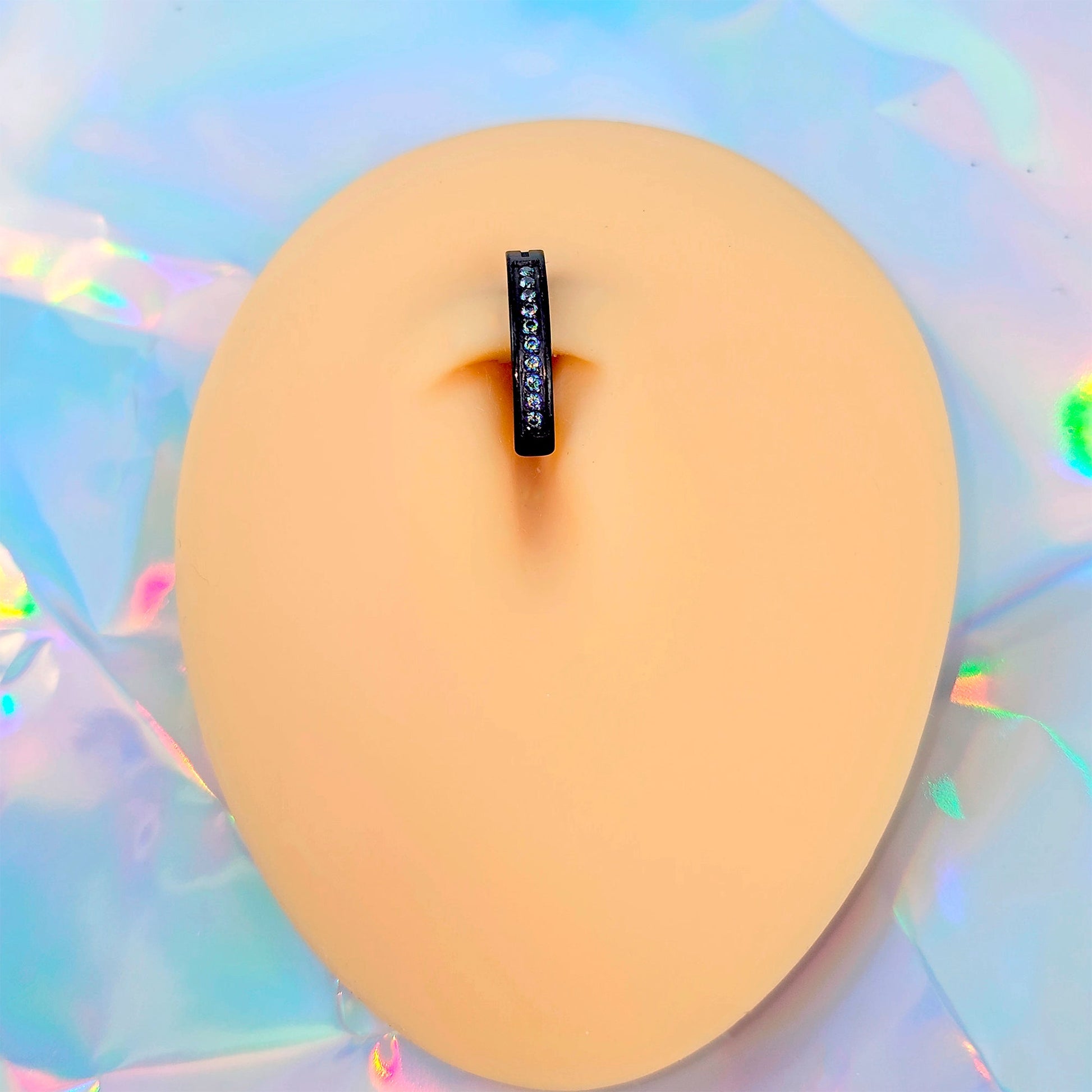 Get fashion forward with this 14 gauge navel ring. It is made with a 3/8 inch black PVD over ASTM F-136 titanium (solid medical grade titanium) hinged circular ring. It features a forward facing row of clear cubic zirconia gems for a classic look of sumptuous style. It also features a non-removable, hinged segment that makes insertion and removal a breeze. You can face the day looking gorgeous with this elegant belly piercing ring.