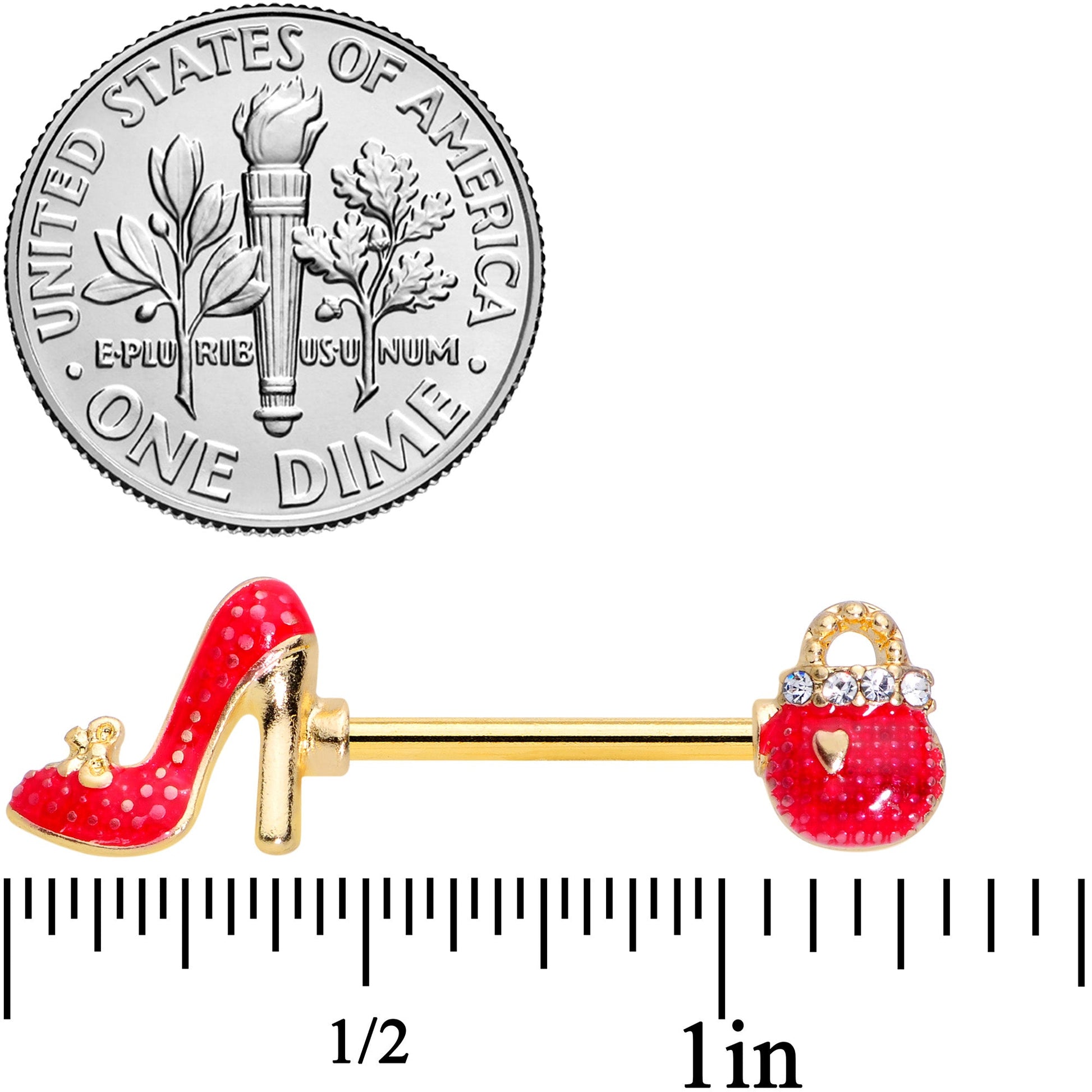 Going shopping? Grab your purse and shoes.....or just grab these 14 gauge nipple rings! They're made with 16mm gold tone PVD over 316L surgical grade stainless steel straight barbells. One end features a red high heel shoe charm and the other end features a red handbag charm that's embellished with clear gems for an extra pop of style. If you're a fiend for fashion or love to shop 'til you drop, this nipple jewelry is perfect for your nipple piercings! Sold as a set of two.