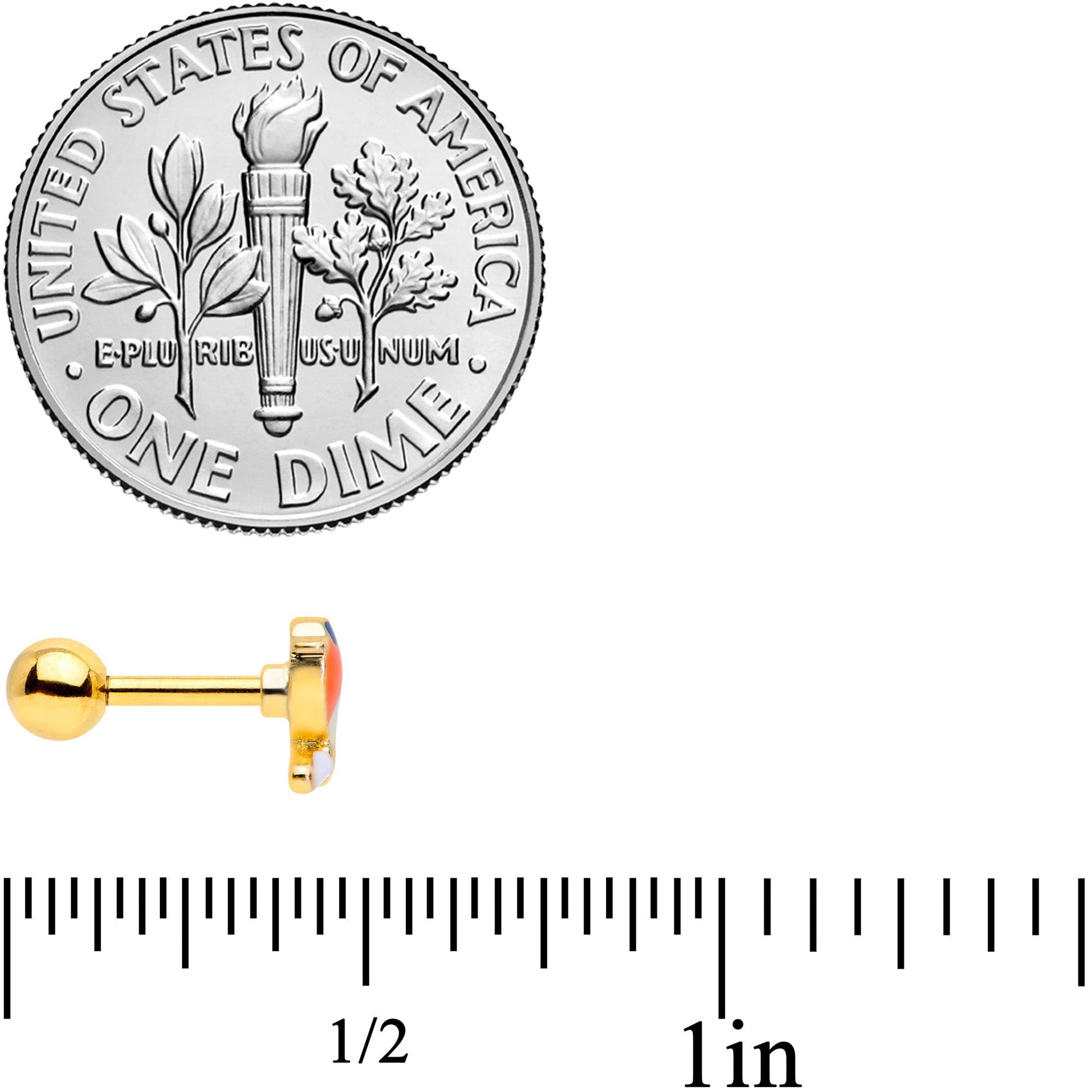 Let this beautiful bird pull up a perch in your cartilage piercing with this 16 gauge tragus stud! It's made with a 6mm gold tone PVD over 316L surgical grade stainless steel straight barbell with a 4mm ball end. The front features a gorgeous orange and white songbird charm with a green gem eye and matching green embellishment. Best of all, this little bird can perch in multiple piercings including helix, tragus, and some conch piercings. With such stunning details, this beautiful bird cartilage jewelry will make you want to burst into song!