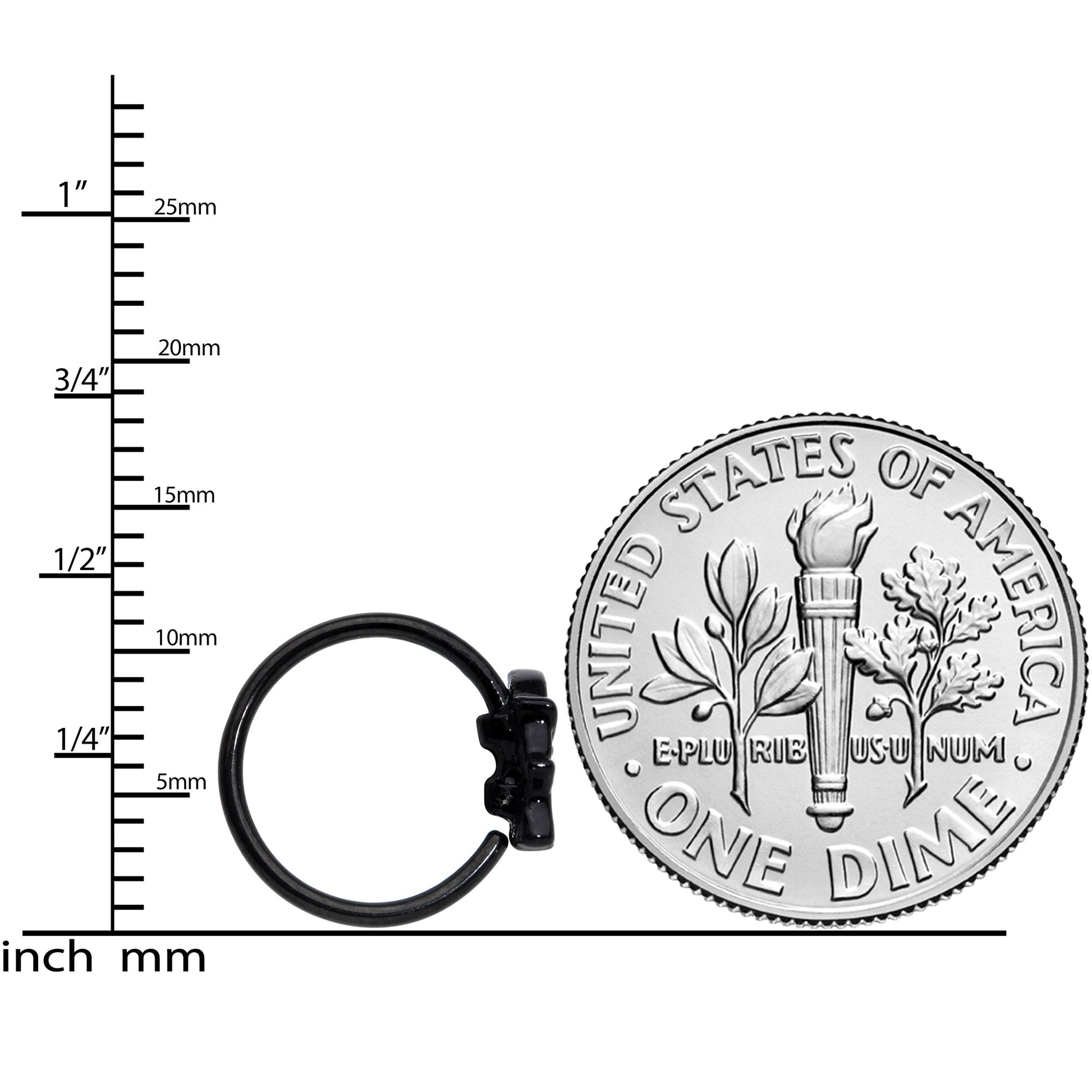 The ghost on this 20 gauge nostril ring got a yummy treat. It's made with an 8mm black PVD over 316L surgical grade stainless steel circular ring. It features a ghost charm, wearing a black and orange striped witch's hat and carrying a candy in matching orange. This sweet, stripe-wearing Halloween ghost nose piercing jewelry is definitely all treat - no trick!