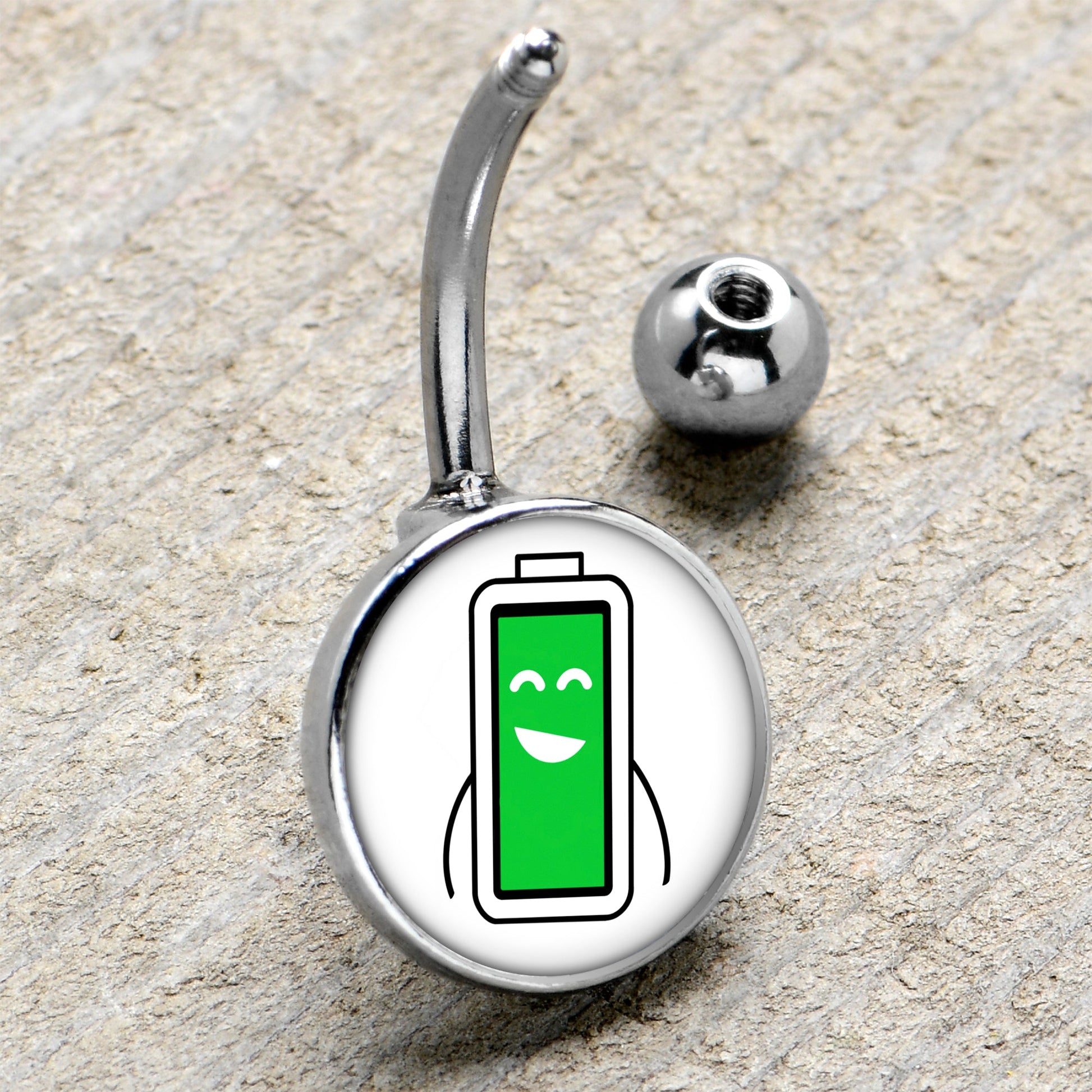 If you are all charged up and raring to go, this navel ring is perfect for you. It is made with a 7/16 inch 316L surgical grade stainless steel curved barbell with a 5mm top ball end. The bottom end features a white disc with a battery icon on it. The battery is green and fully charged and looks appropriately pleased with the situation. Let the world know that nothing can drain your energy with this cheery charged battery belly piercing ring.