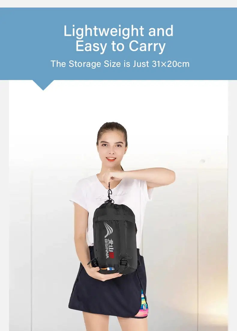 ▶Compact and portable: This sleeping bag has its own compression bag, which has two tightable strips. Press bag and fixed by two strips, the volume will reduce 2 times than before. After compression, sleeping bag can put in backpack or hang on backpack suspension system.