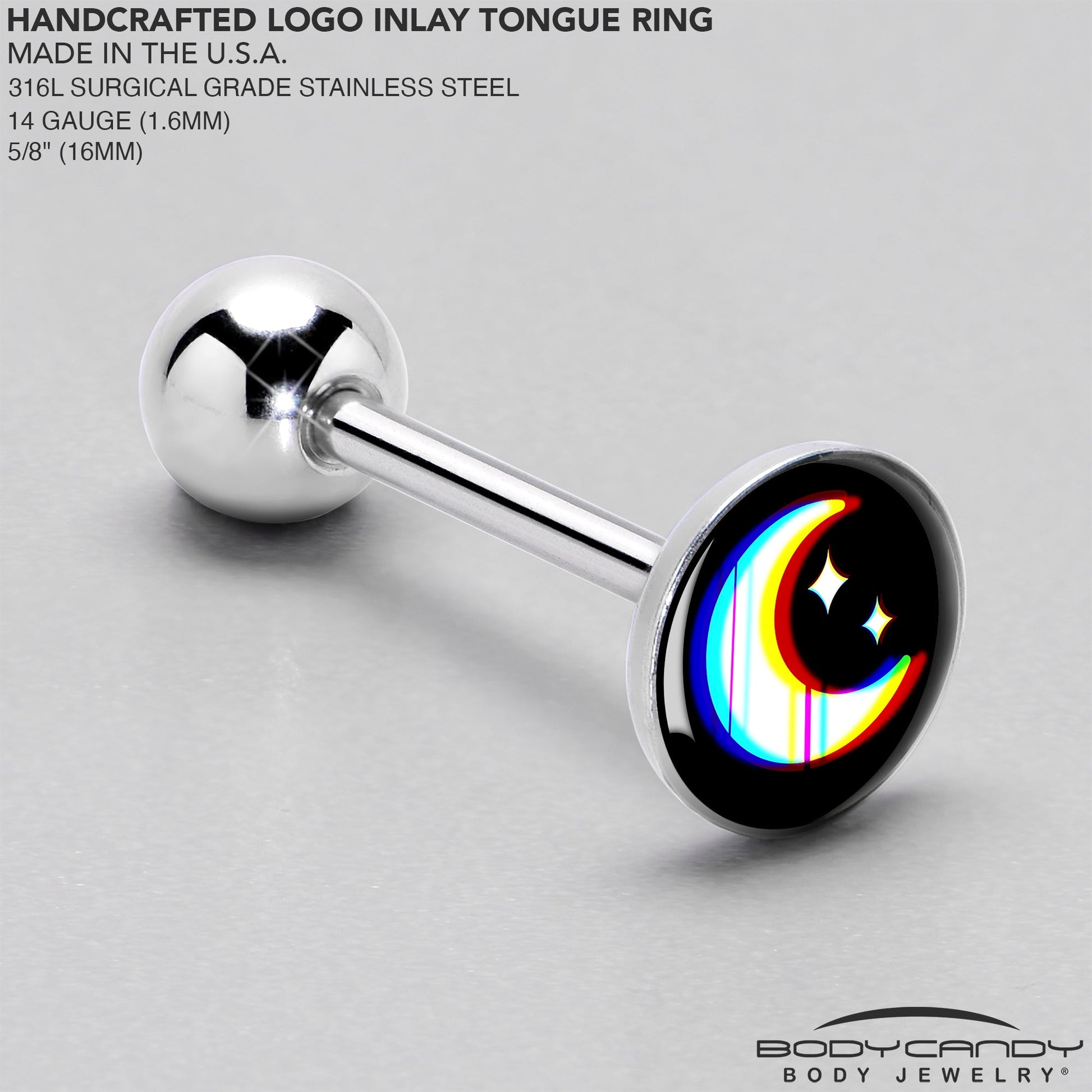 This vibrant moon is wearing peaceful colors on this 14 gauge tongue ring. It's made with a 5/8 inch 316L surgical grade stainless steel straight barbell with a 6mm bottom ball end. The top end features a chromatic crescent moon charm on a black background, with a pair of matching stars set in the moon's curve. Show the world you love all the colors of the night with this lovely, lunar tongue piercing jewelry.