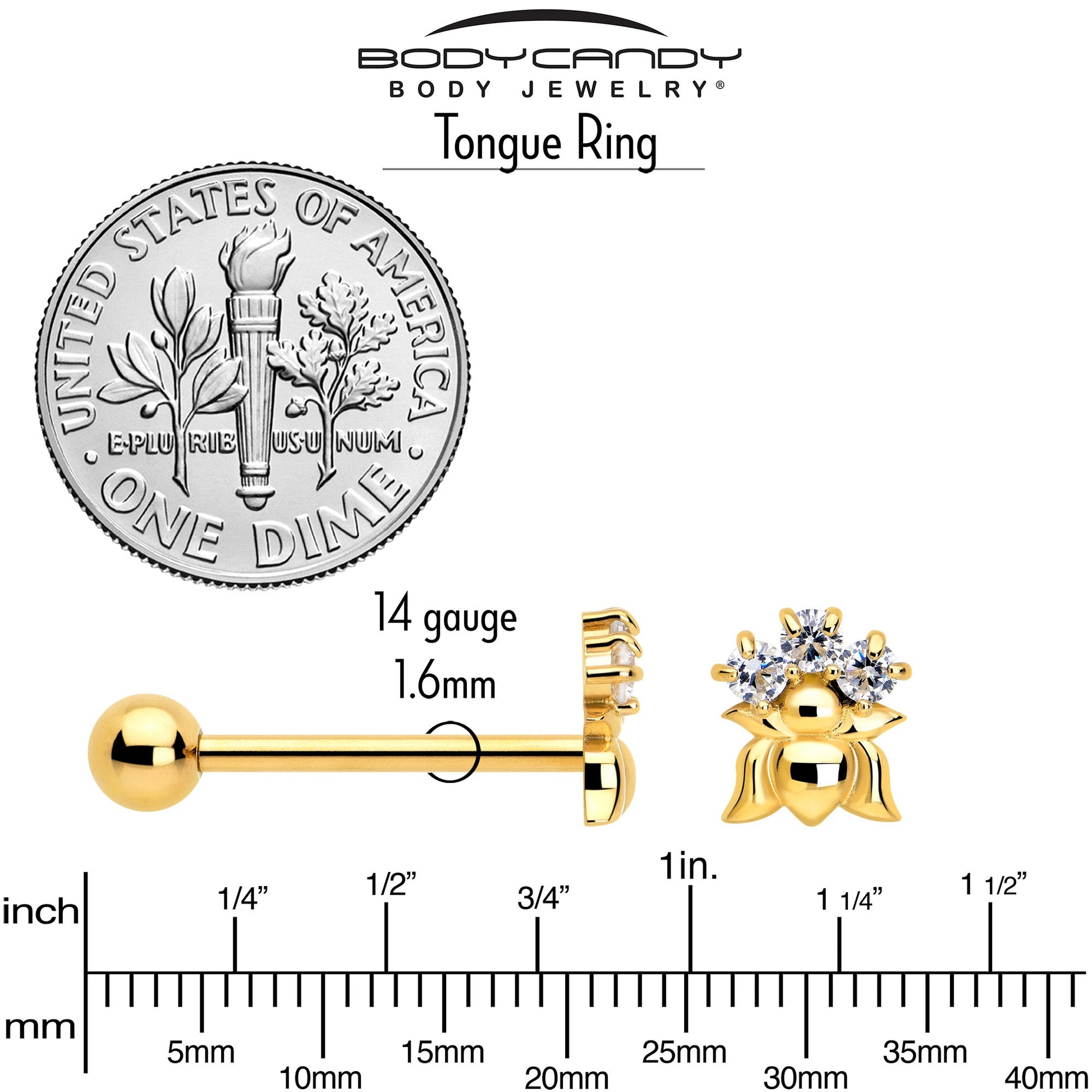 Get loaded up on lotus flower style when you wear this luscious 14 gauge tongue jewelry. It is made with a 5/8 inch gold tone PVD over 316L surgical grade stainless steel straight barbell with a 6mm bottom ball end. The top end features an elegantly curved lotus flower charm, set with clear cubic zirconia gem embellishment. Speak your peace with this luxurious lotus flower tongue piercing ring.