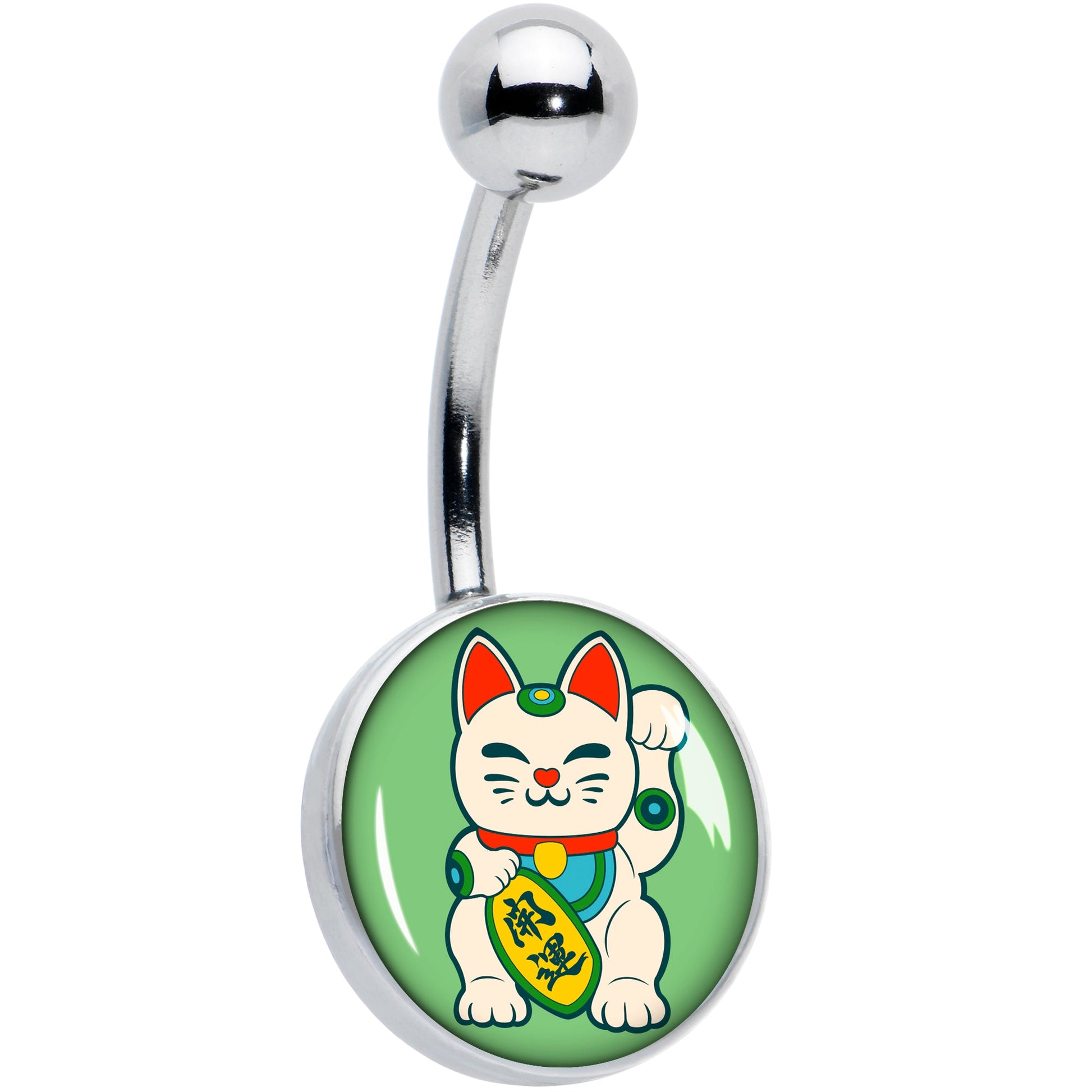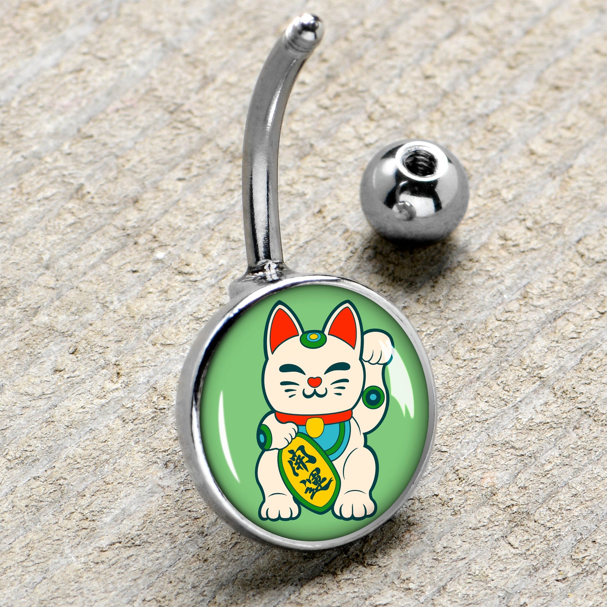 You will be feeling super lucky when you have on this 14 gauge navel ring. It is made with a 7/16 inch 316L surgical grade stainless steel curved barbell with a 5mm top ball end. The bottom end features a green disc with a Maneki-neko lucky cat on it. The cat is white with red embellishment and has one paw up in the air for its traditional wave. This waving cat will make you feel like you have lucked into some elegant style on this belly piercing jewelry.