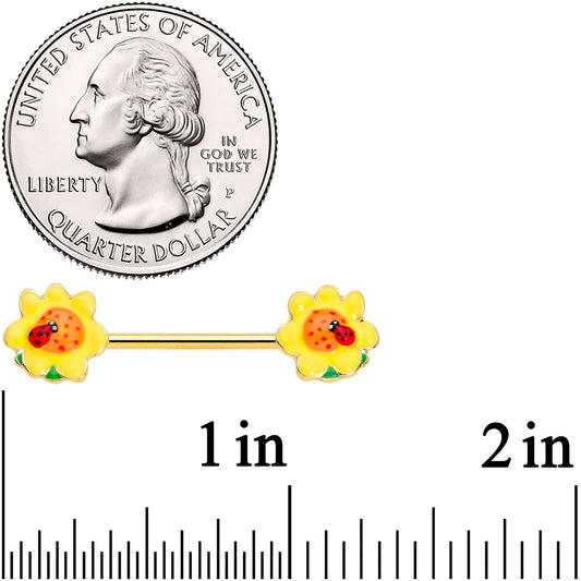 14G 5/8 Gold Tone Sunny Flower Ladybug Barbell Nipple Ring Set