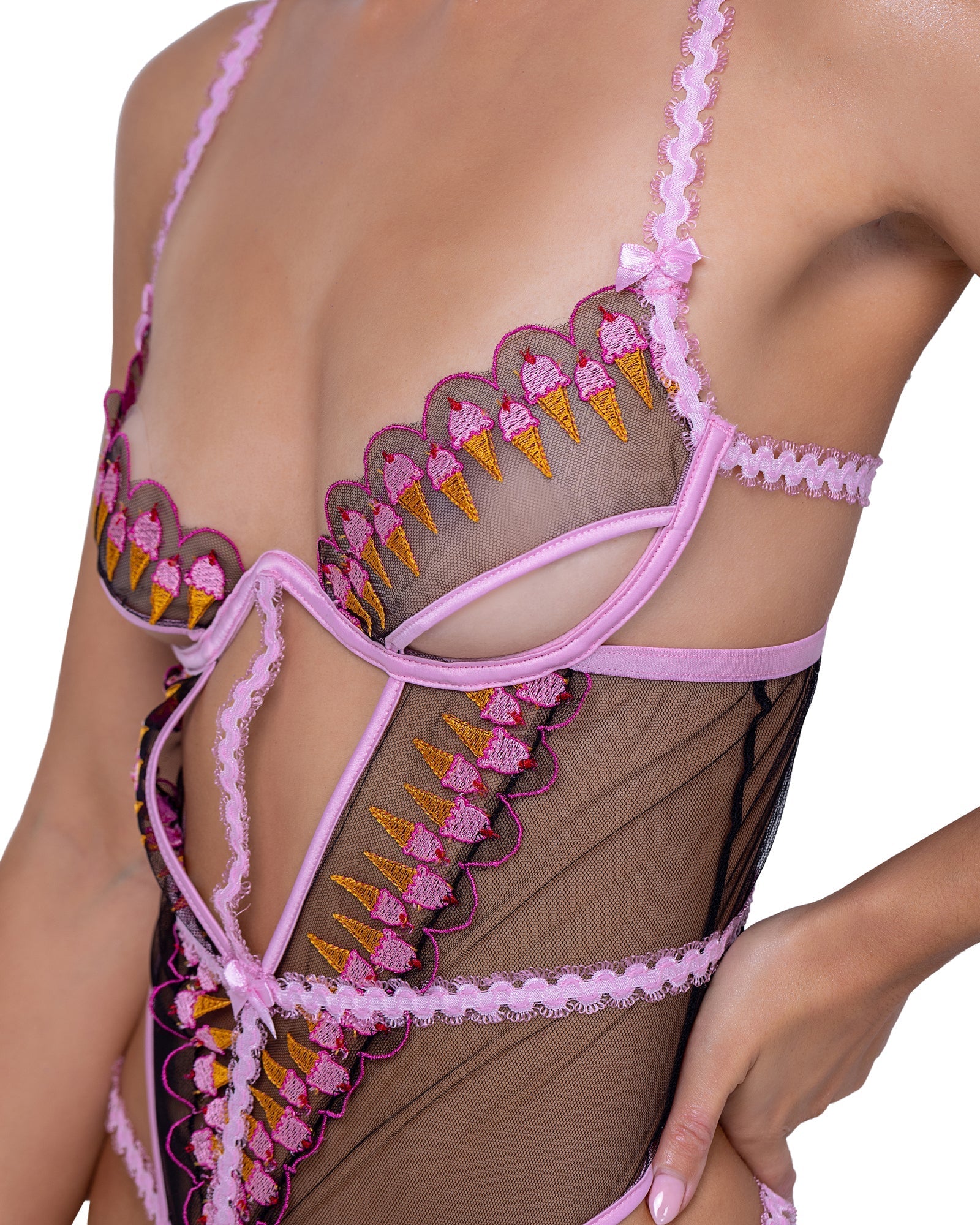 Leave nothing to the imagination! Nothing is sexier than wearing see-through teddy lingerie. This pink and black lingerie bodysuit is wrapped in an ice cream embroidered illusion tulle and satin ribbon bow detail that will accentuate all of your curves from top to bottom. Turn up the heat and be flirty in this sexy teddy lingerie if you want to spice up a night at home. Start your Spring lingerie collection in this irresistible look, the perfect nightwear to look and feel gorgeous.