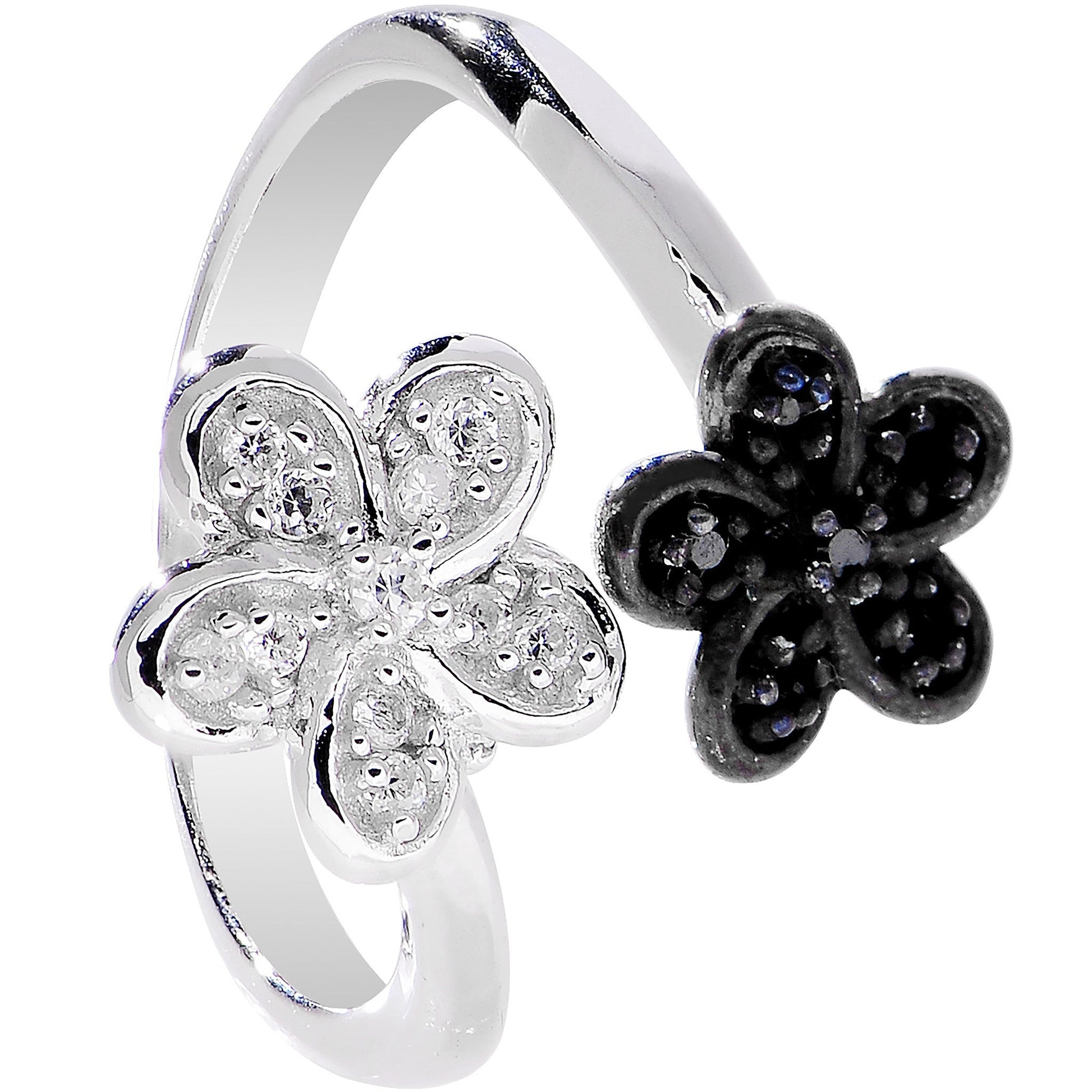 Be the envy of everyone on the beach with a .925 sterling silver and cubic zirconia dual flower toe ring. The gleaming toe ring features two five-petal posies - one in black - with sparkling clear and black CZ accents. Ring includes a .925 metal stamp engraved on the inside of the ring. Adjustable toe ring is one size.