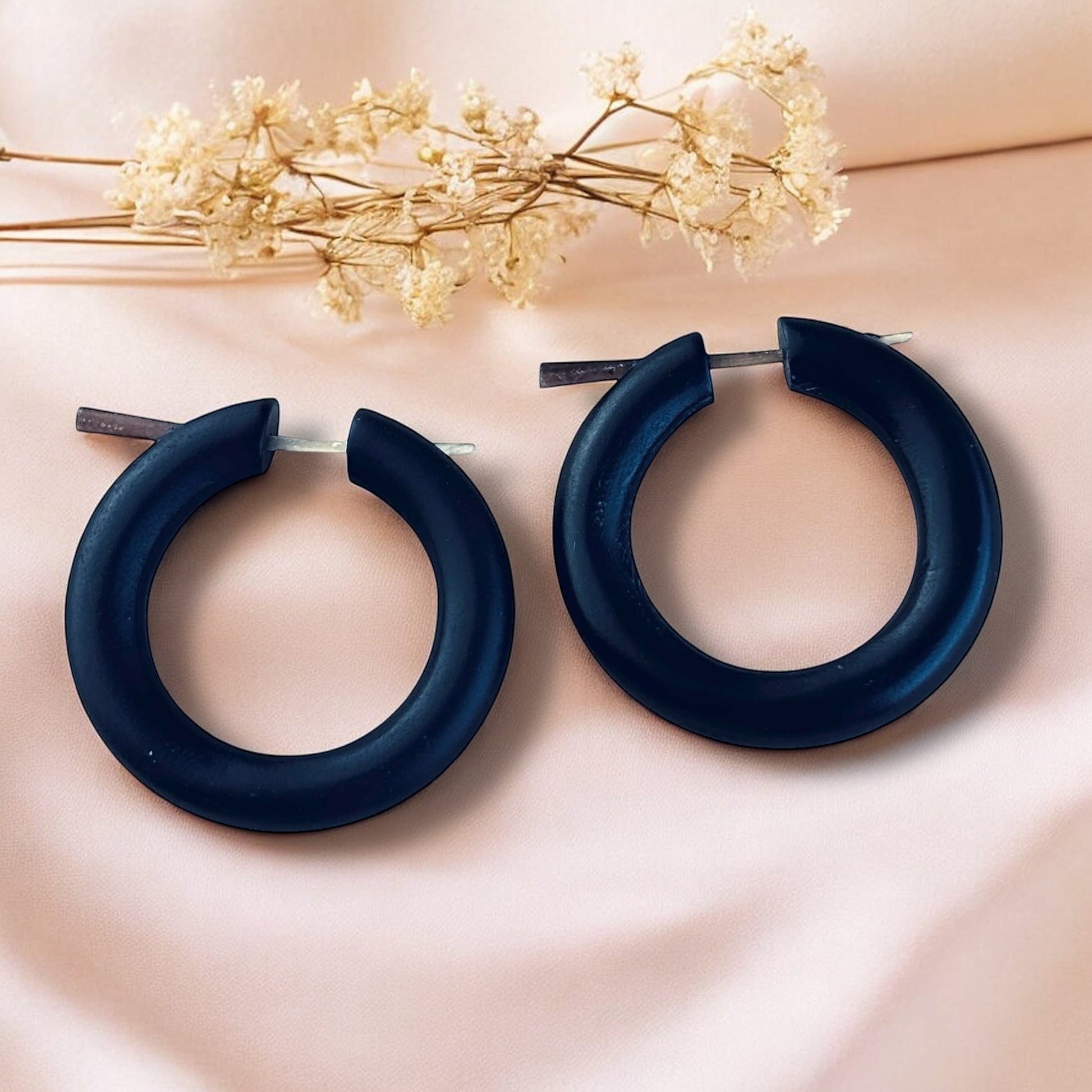 Add a touch of boho chic to your style with these unique black wooden hoop earrings! These earrings will elevate any outfit and bring a playful and quirky touch to your look. Perfect for the fun-loving and stylish woman.