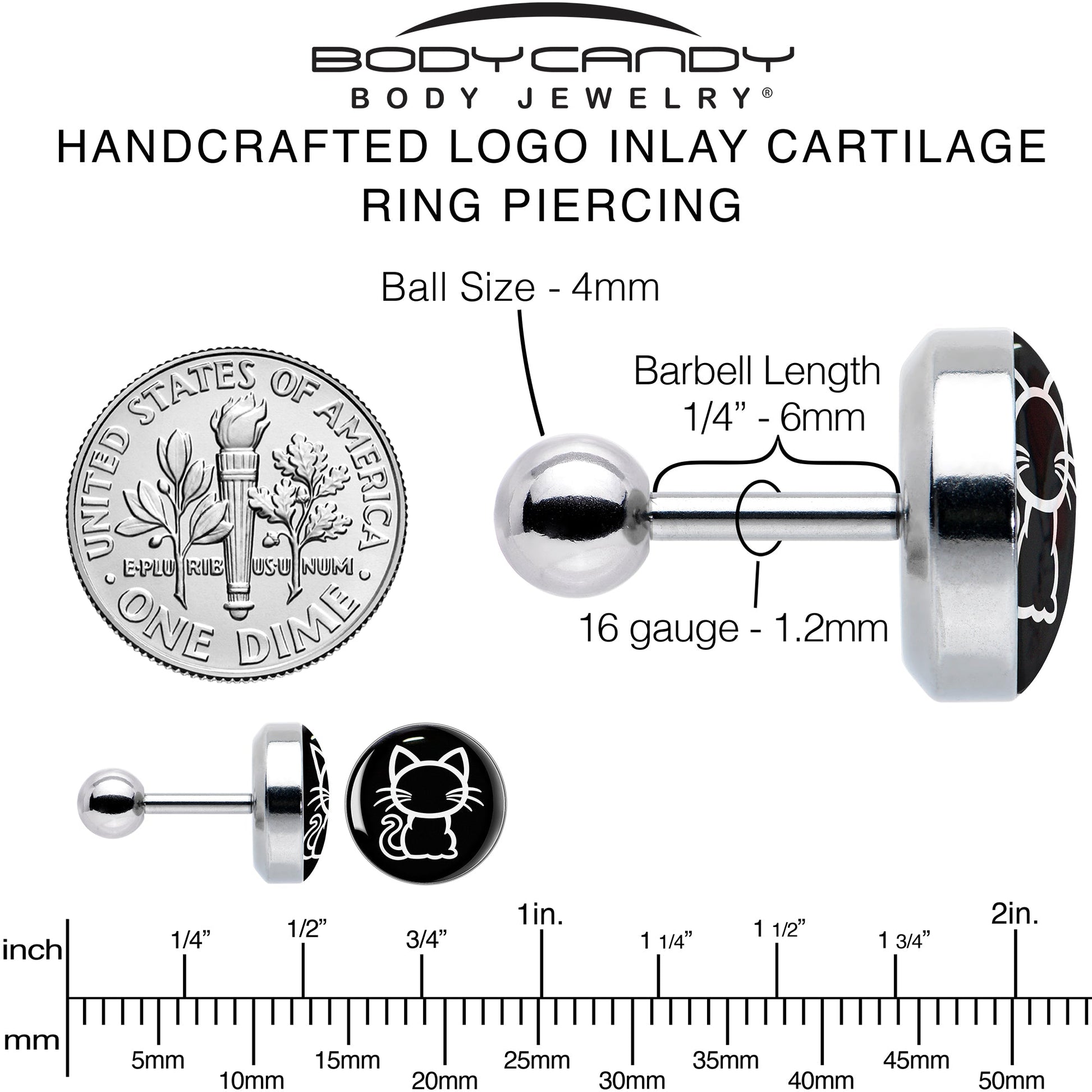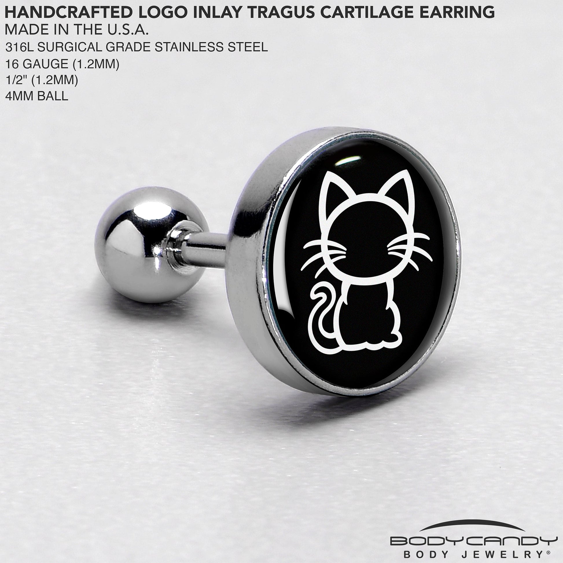 Keep it simple while keeping it as adorable as the kitty cat on this 16 gauge tragus stud. It's made with a 6mm durable 316L surgical grade stainless steel straight barbell with a 4mm ball end. It features a cat charm. The cat is styled with the simplest of detailing in white against a black background for visual impact and you can rock it in multiple piercings including tragus, helix, and some conch piercings. You'll be ready to purr like a pussycat with this fabulous feline cartilage piercing jewelry.