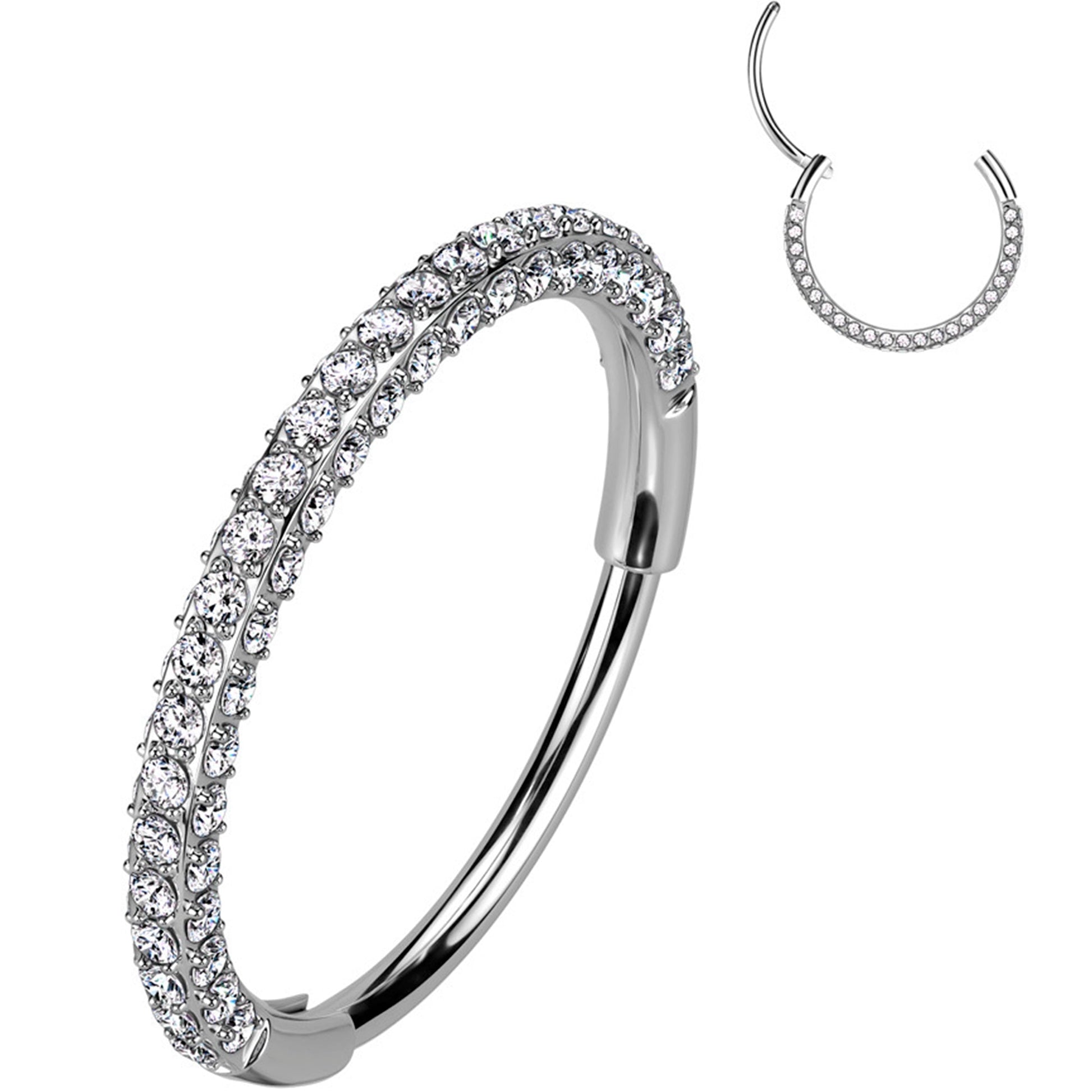 18 Gauge (1mm) Hinged Closure, Implant Grade Titanium 6AL-4V-ELI ASTM F-136, Cubic Zirconia 3 Paved Sides, Segment Ring, Available in diameter sizes from 7mm to 10 mm