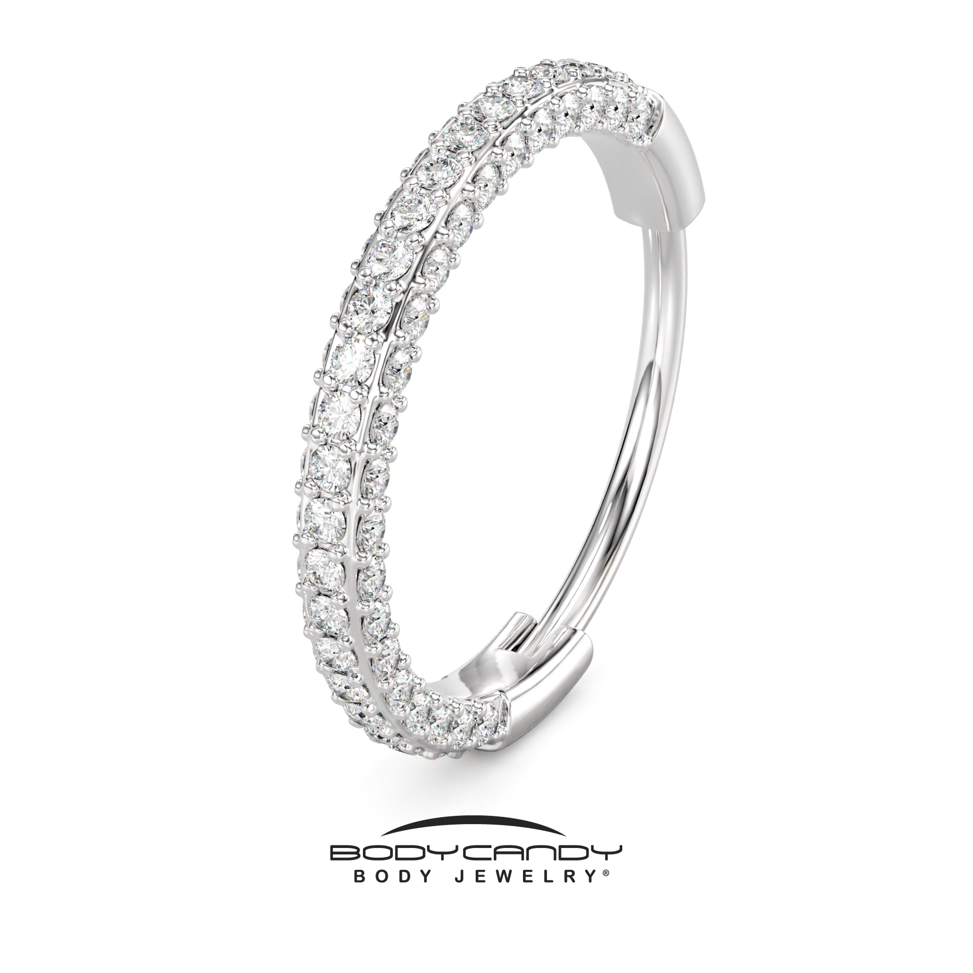 Add a look of sophistication to your nose piercing or ear with this 18 gauge implant grade titanium hinged nose ring piercing! The bottom arc of this tragus ring is paved with cubic zirconia gems on both the front and sides of the hoop for a look that's totally attention-getting without being over-the-top.