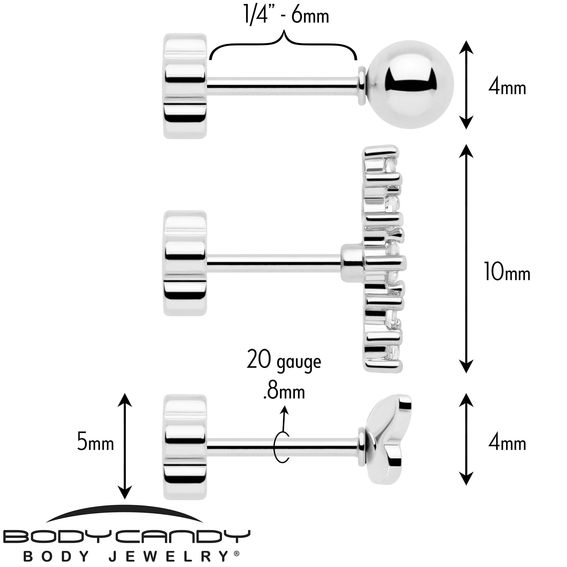 20 Gauge CZ Gem Ball Arch Butterfly Reversible Flower Flat Back Earring Set of 6