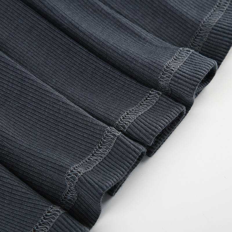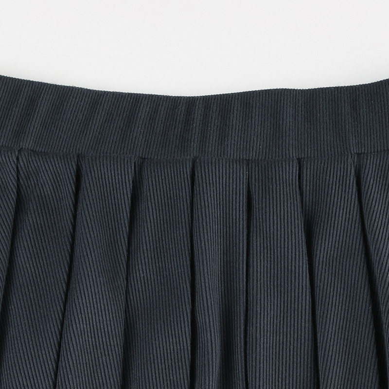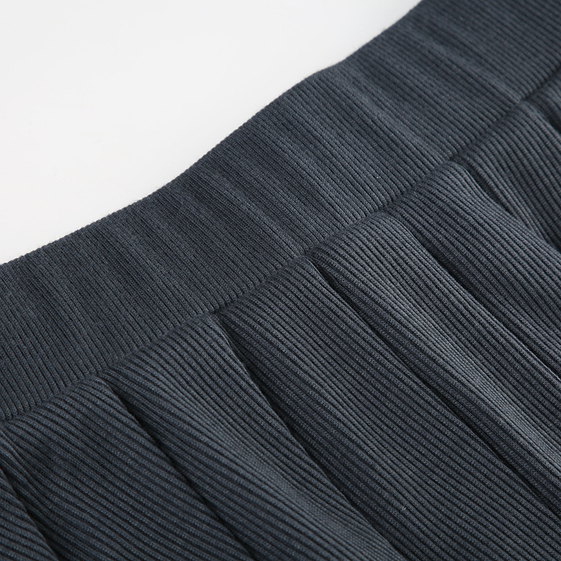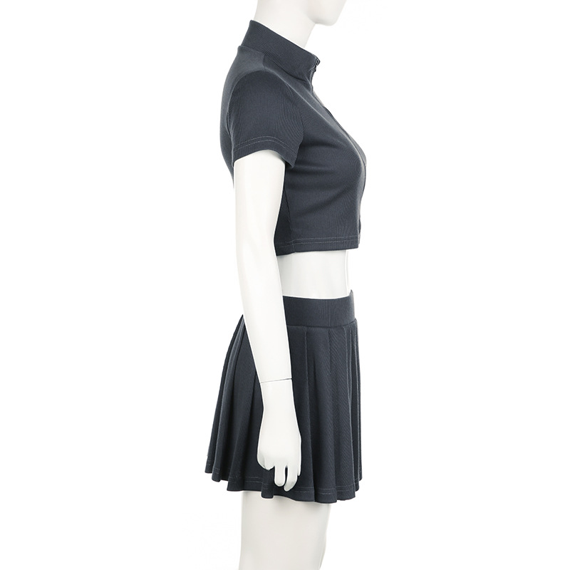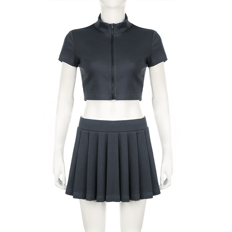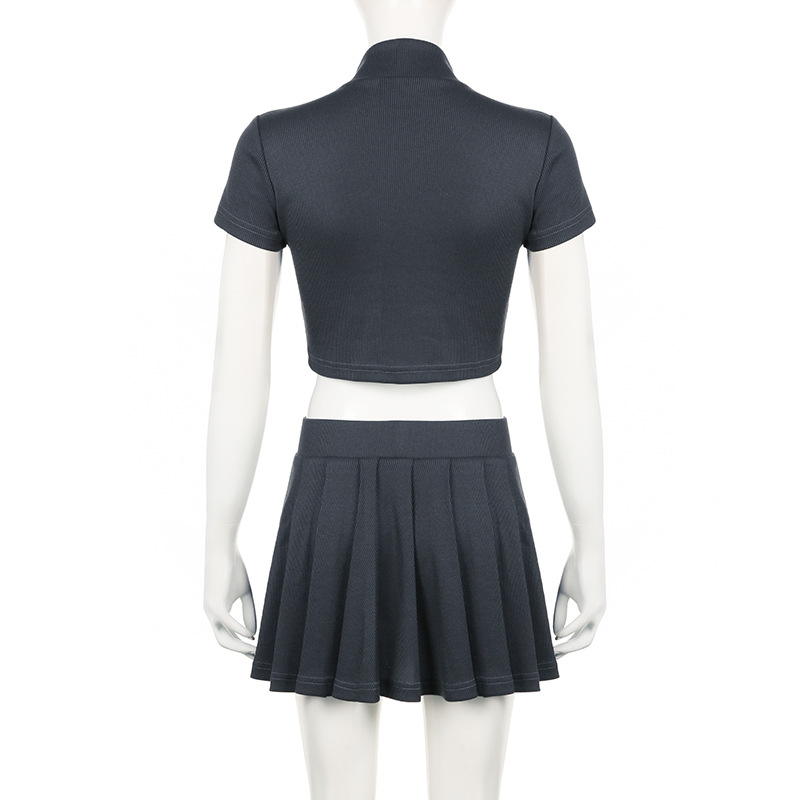 Casual Women Rib Knitted Solid Color Zipper Top Short Sleeve Pleated Skirt Set Short Skirt Two Piece Sets