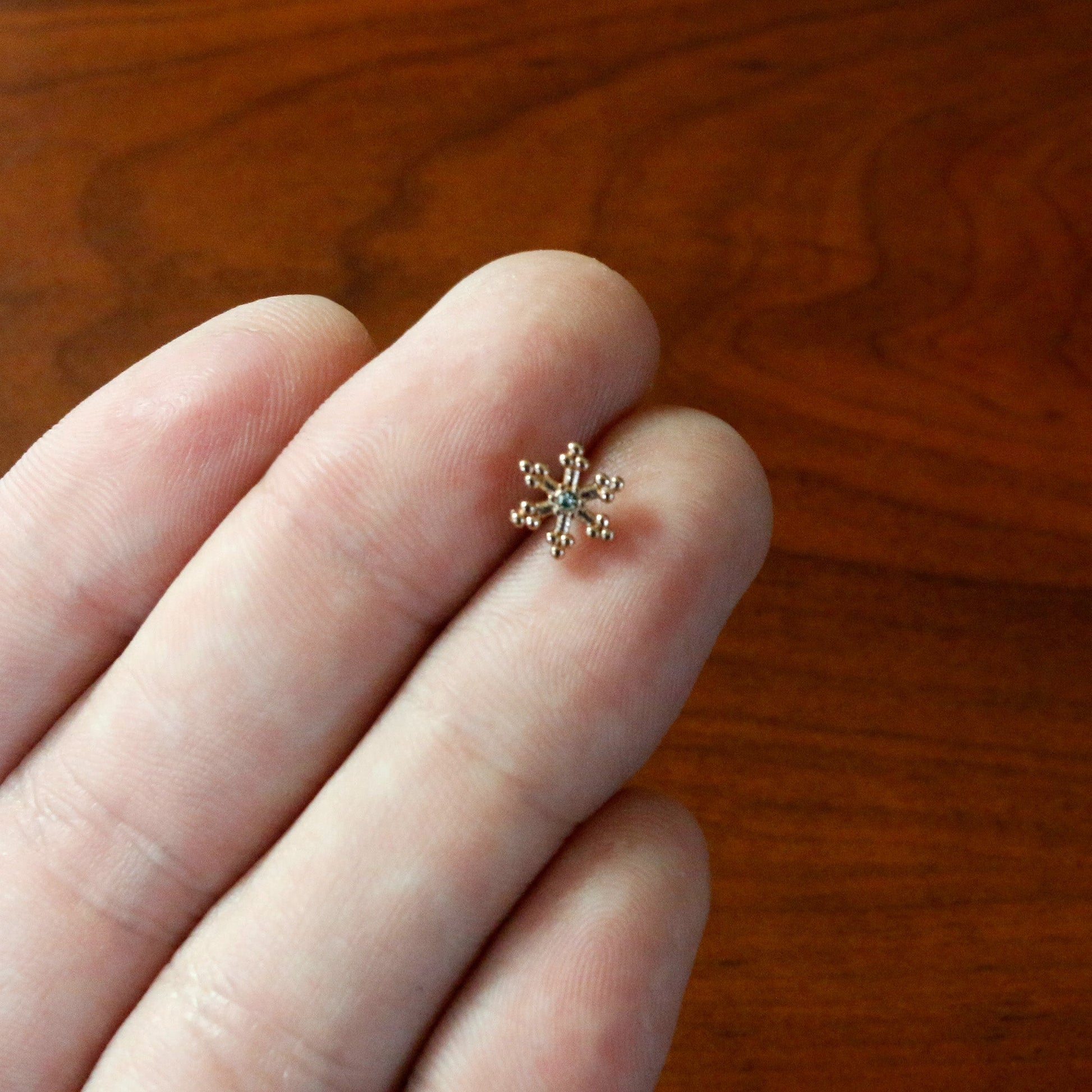 The snowflake on this 16 gauge cartilage stud won't melt, but it just might melt your heart! It's made with a 6mm rose gold tone PVD over 316L surgical grade stainless steel straight barbell with a 4mm ball end. It features a snowflake charm, with textured detailing and a clear gem set at the center. You can even sport this snowflake in multiple piercings including tragus, helix, and some conch piercings! How could you leave it out in the cold?