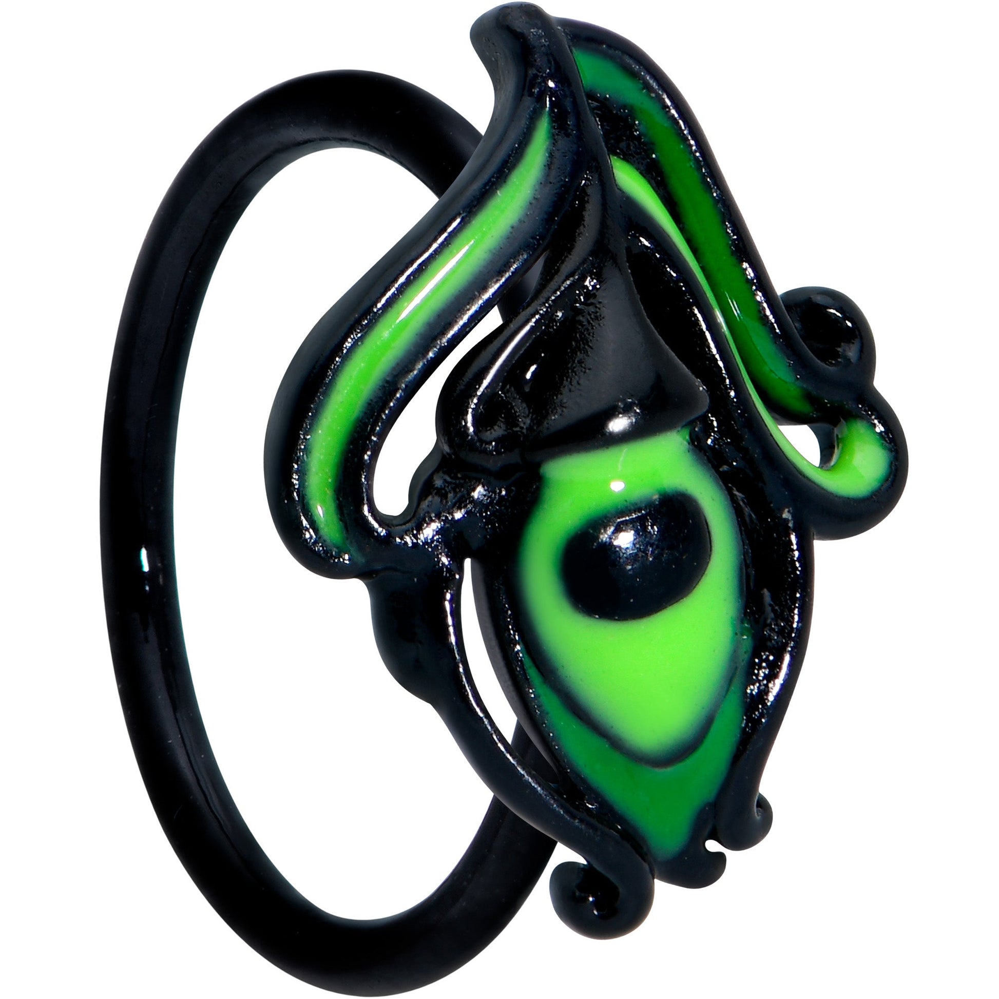 This 20 gauge nostril ring is so striking you can hardly take your eyes off of it! It's made with an 8mm black PVD over 316L surgical grade stainless steel circular ring. It features a peacock feather charm, inlaid in an eerie bright green. It's even embellished with tendrils along the side, giving it the appearance of a real feather! You'll definitely want to strut your stuff when you're nesting this avian nose ring in your nostril piercing!