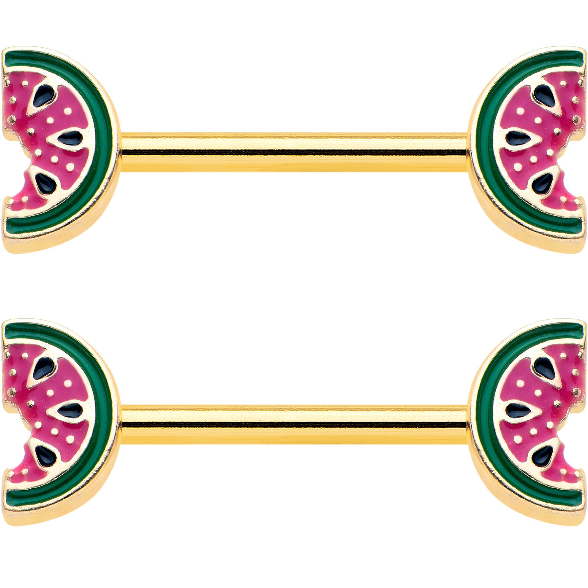 14 Gauge 9/16 Gold Tone Watermelon Bite Barbell Nipple Ring Set