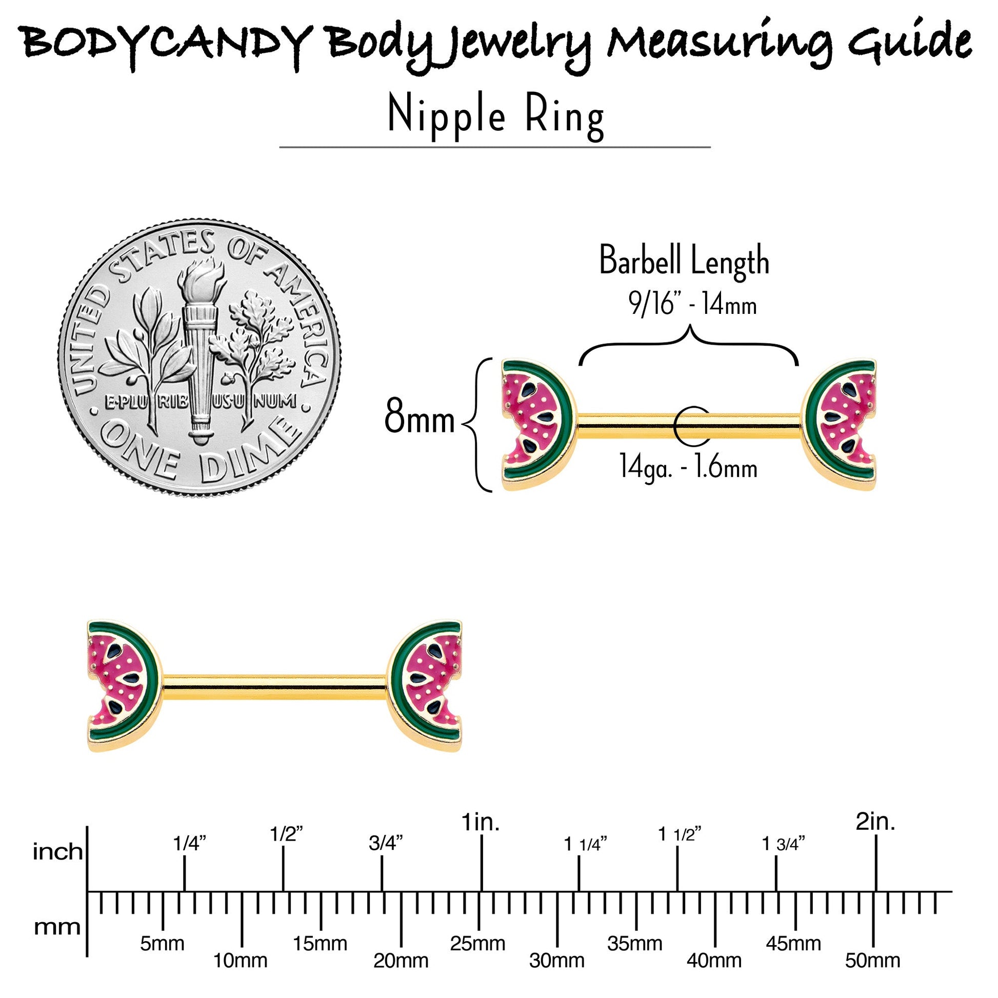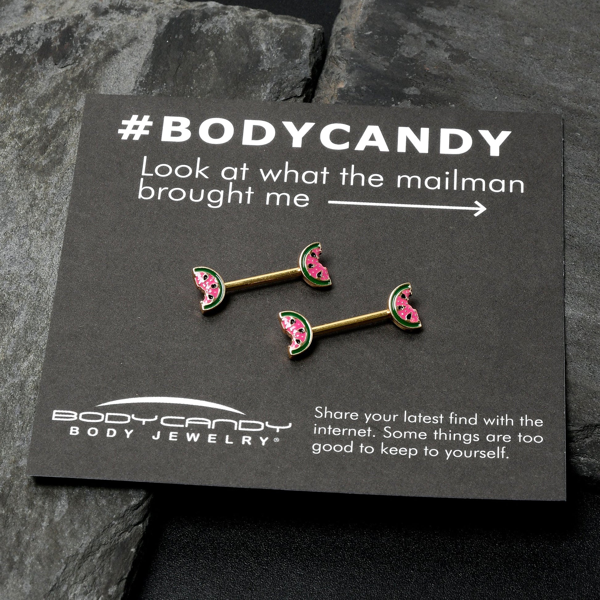 Take a bite of style with this tasty 14 gauge nipple jewelry. It is made with 14mm gold tone PVD over 316L surgical grade stainless steel straight barbells. Each of the ends features a watermelon slice charm, inlaid in red and green with black seed embellishments. The tasty fruits even have a bite already taken out. You too will find these yummy melon nipple piercing rings irresistible. Sold as a set of two.