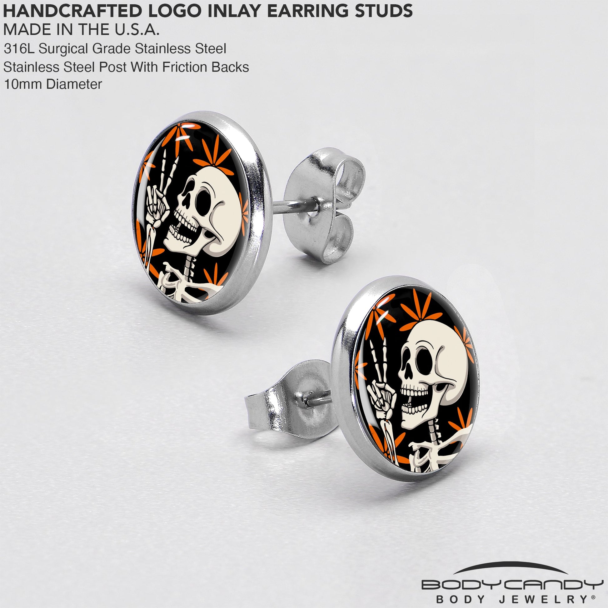 Feel the music all the way to your bones like the skeletons on these stainless steel stud earrings for pierced lobes. They're made with stainless steel straight posts with friction backs for a secure fit. At center stage is a skeleton, throwing a peace sign with its bony fingers while appearing to enjoy the music. You'll be ready to bang your head while you raise the dead when you're rocking these skeleton stainless steel pierced earrings. Unique artist-drawn logo inlay design stainless steel earrings. Sold as a set of two.