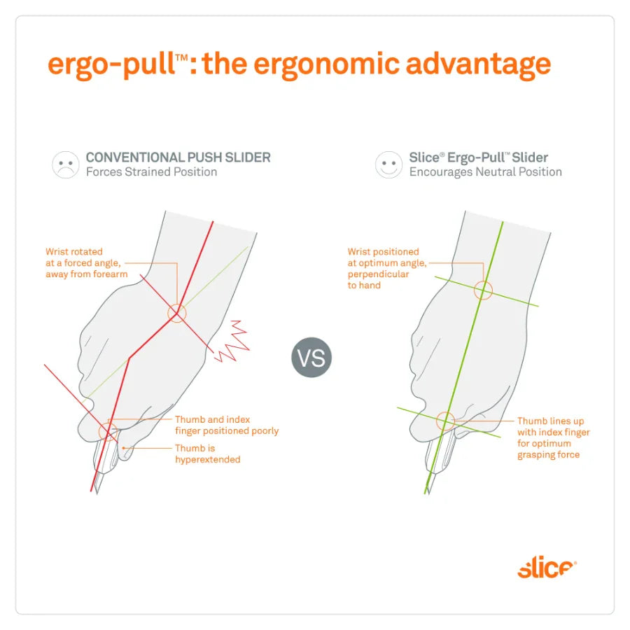 The Slice® Smart-Retracting Utility Knife combines safety and intelligence to reduce injuries and increase productivity. The tool’s blade is the safest you’ll find in the workplace. Its unique finger-friendly® blade is safe to the touch and therefore causes fewer and less severe injuries than traditional blades. To further protect your frontline workers, the blade instantly self-retracts when it loses contact with its cutting material. The Ergo Pull™ slider that extends the blade reduces hand strain because users slide this feature in the same direction as the cut. While a durable reinforced nylon handle provides strength and comfort, so the multi-purpose knife is ideal for industrial usage - especially as it has a longer blade for thicker cuts. This clever tool is suitable for left- and right-handed workers, and an integrated lanyard hole and tool-free blade-change mechanism help frontline workers operate more efficiently.Highlights
