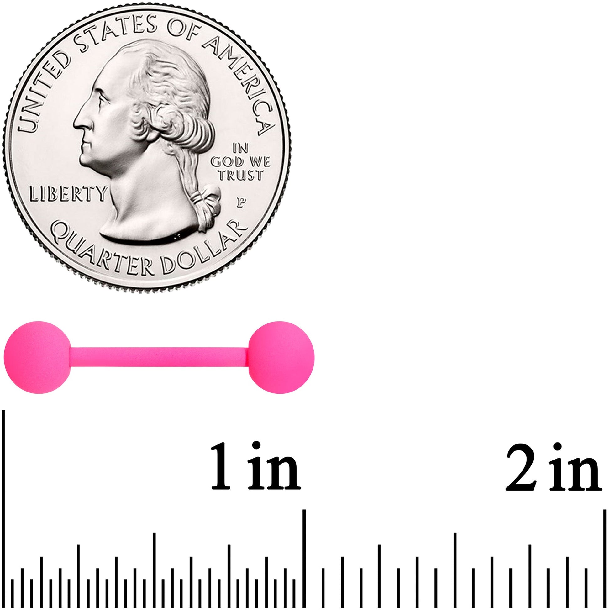 Let your words shine while your tongue piercing stays more subtle with this 14 gauge tongue piercing jewelry! It's made with a 5/8" hot pink matte plated over 316L surgical grade stainless steel straight barbell. It features 5mm matching acrylic ball ends for a cohesive look. If you want to add a ton of color to your tongue piercing but prefer a more understated appearance, this bright pink tongue jewelry is sure please.Specifications