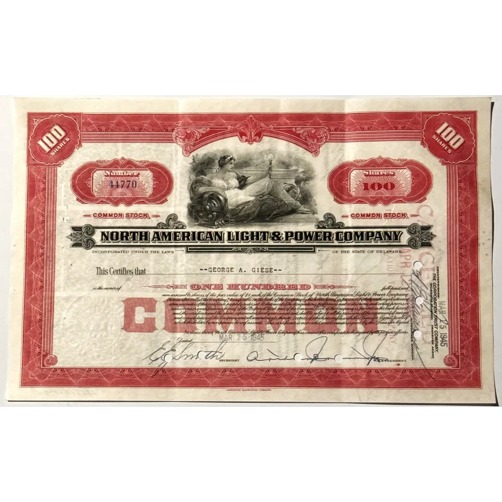 Behold a thrilling piece of financial history! This North American Light and Power Company stock certificate is not just a piece of paper, but a tangible connection to a pivotal moment in American business. Founded in South Bend, Indiana, and helmed by Clement Studebaker, Jr. - a scion of the legendary Studebaker automobile family - this utility holding company was a major player in the energy sector. The certificate you see before you survived the tumultuous breakup of its parent conglomerate, the North American Company, by the U.S. Securities and Exchange Commission in the 1940s. This seismic event reshaped the landscape of American utilities and corporate structure, making this certificate a true relic of a bygone era.