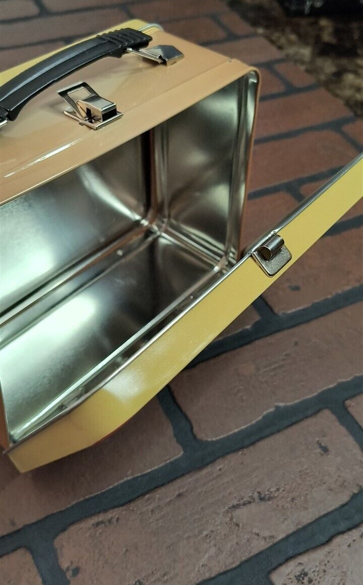 Add a touch of nostalgia to your collection with this vintage tin tote lunch box. Perfect for collectors or anyone who loves retro designs, this tin tote is both functional and stylish.
