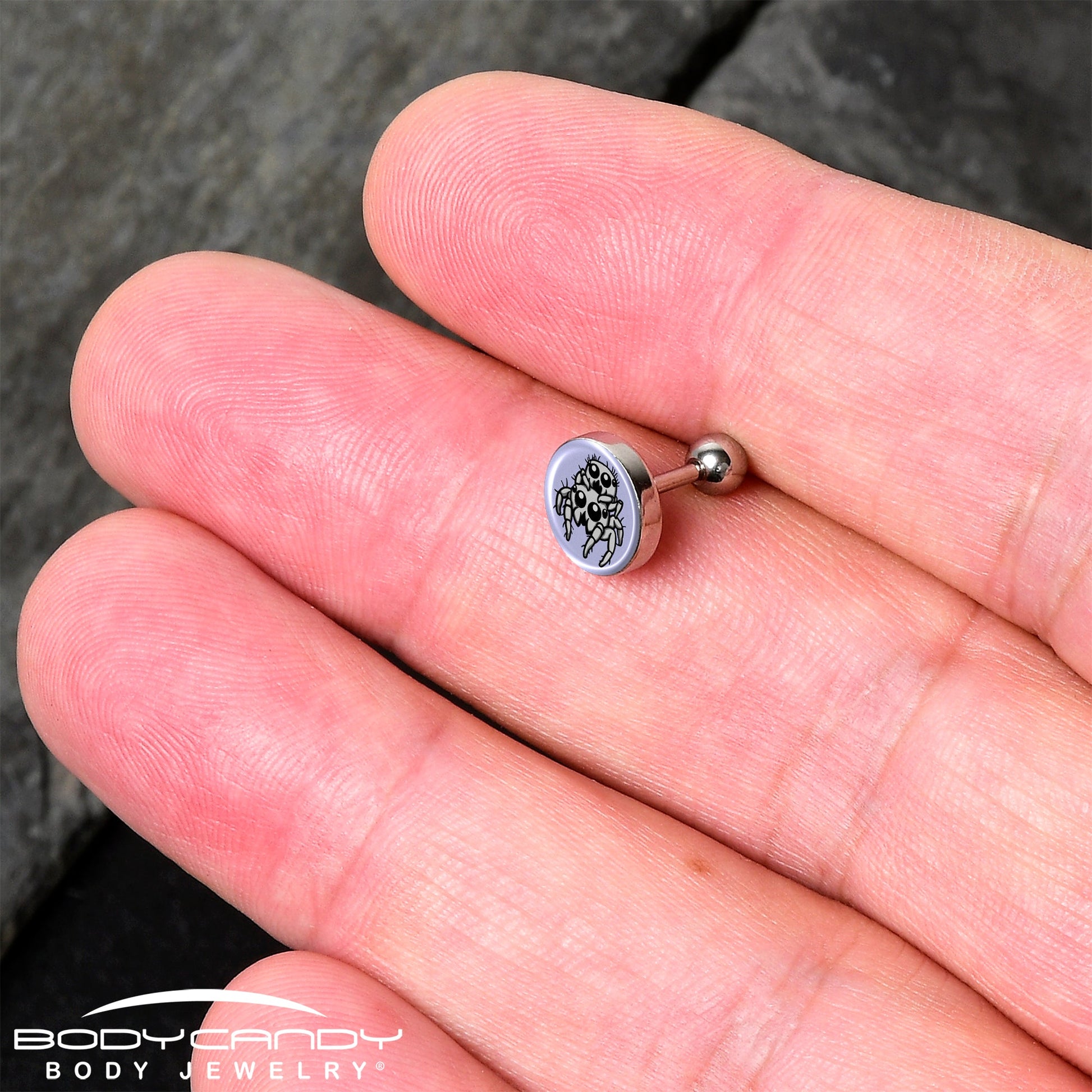 Add a playful touch to your cartilage jewelry collection with the Leaping Leapfrog Spiders tragus stud! Featuring artist hand-drawn artwork of quirky leapfrog spiders, this unique piece is perfect for showing off your bold style. Crafted from hypoallergenic materials, this 16-gauge cartilage ring is gentle on sensitive skin and built for long-lasting wear. Hand-assembled in the USA, it combines creative artistry with meticulous craftsmanship to bring you a standout accessory that's truly one of a kind.