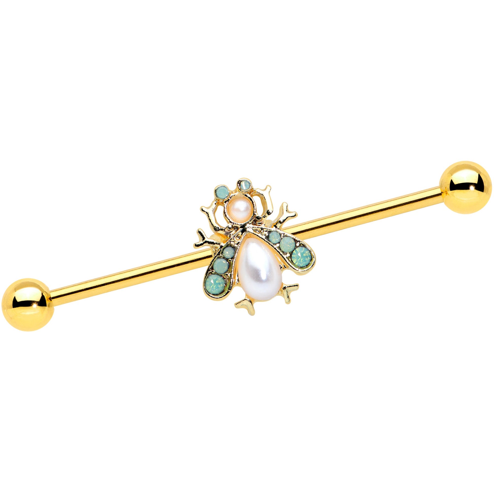 The insect on this 14 gauge helix barbell has tons of wintery style! It's made with a 1 1/2" gold tone PVD over 316L surgical grade stainless steel straight barbell with 5mm ball ends. It features an insect charm, with white pearlescent orbs for its body and head. The wings are set with green pearlescent orbs for a colorful and cohesive look. You can even slide this snow bug up and down the length of the barbell for the perfect look. Why let winter bug you when you rock this elegant insect barbell earring!