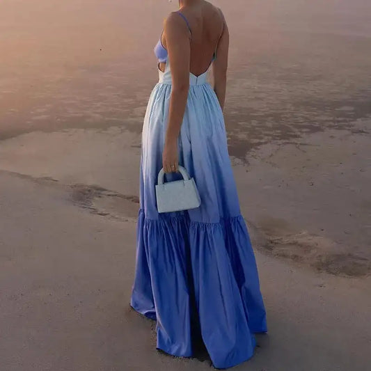2024 New Spaghetti Strap Gradient Print Long Dress Lady Sexy V-neck Hollow Backless Evening Dress Elegant Sleeveless Slim Dress