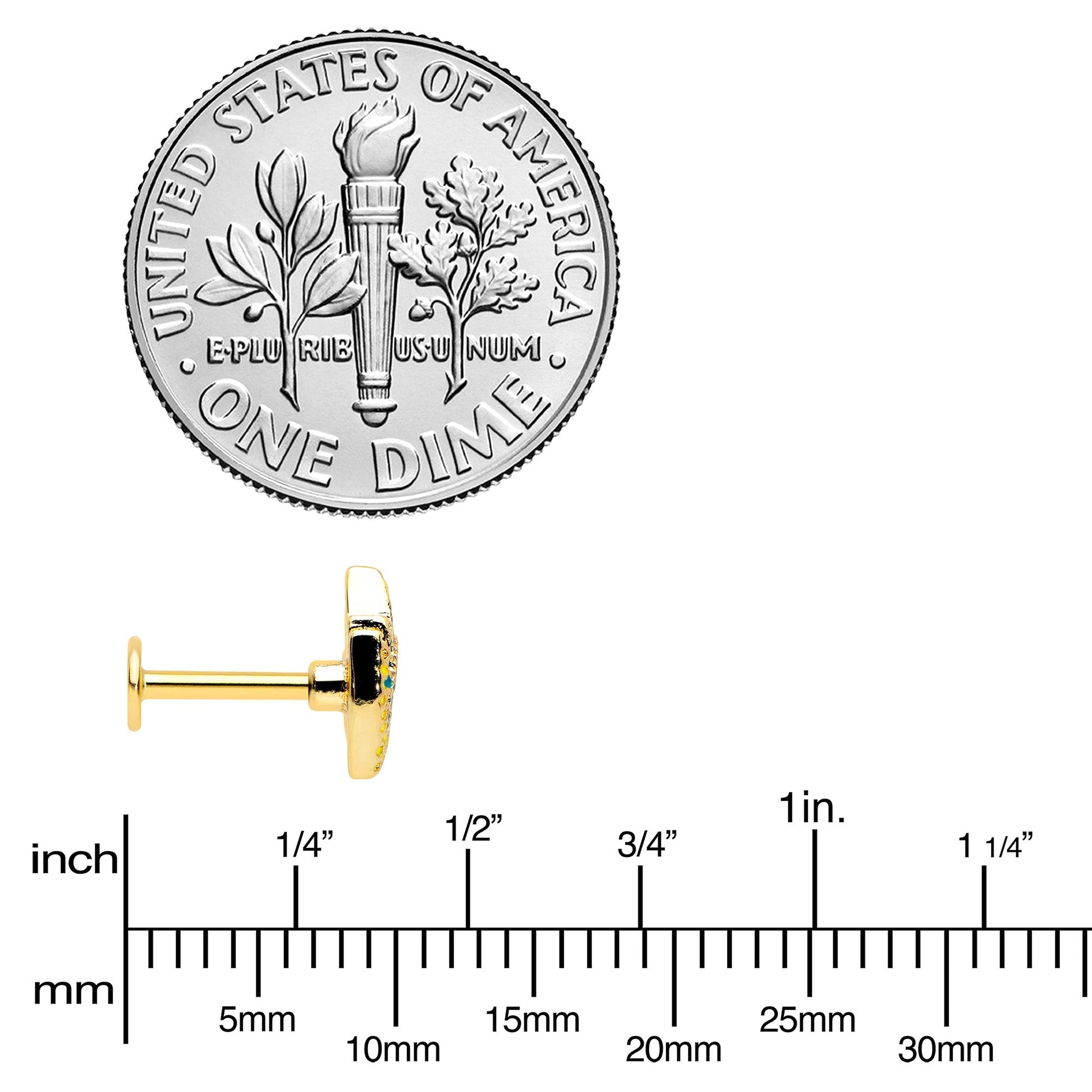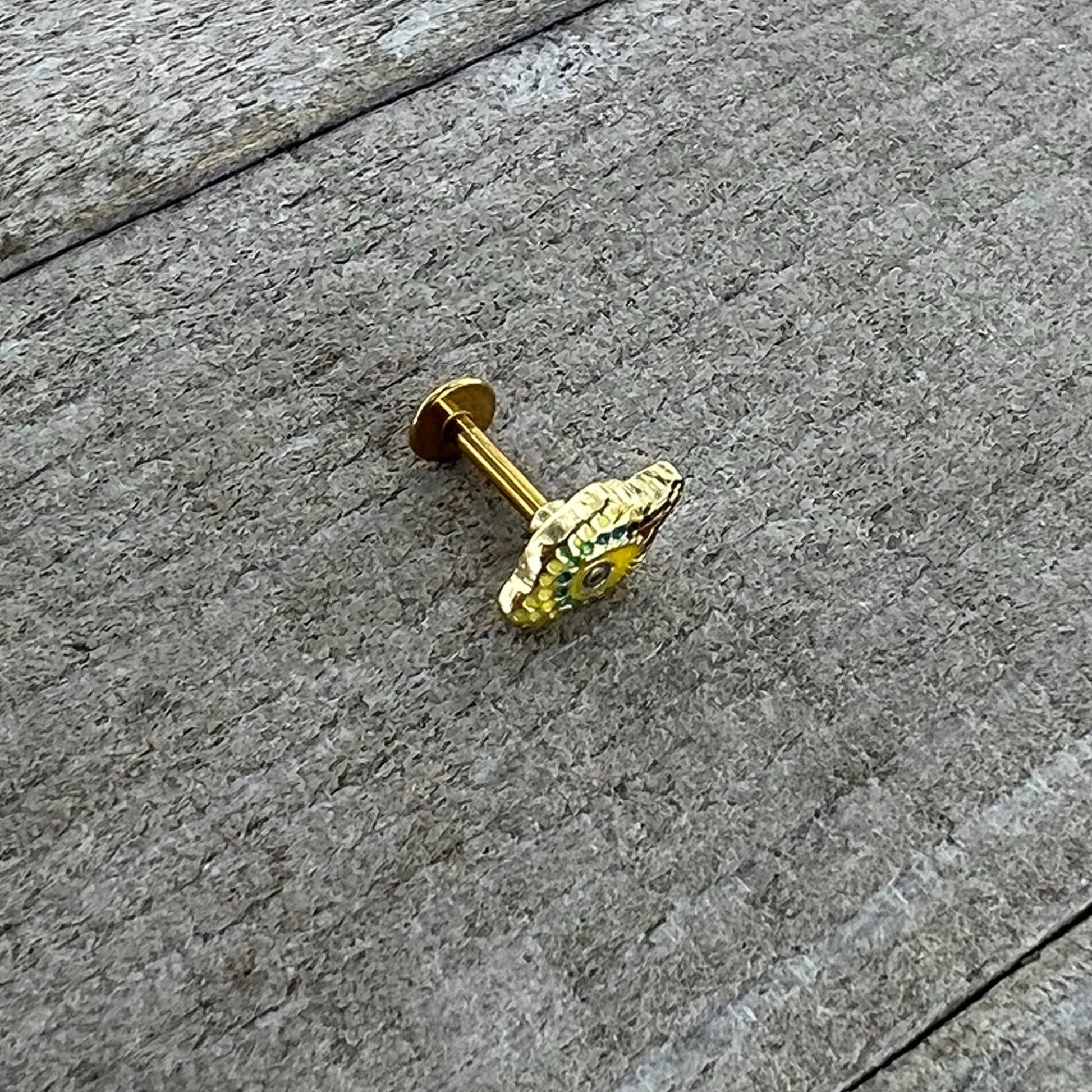 The feather left behind on this 16 gauge cartilage jewelry came from one bold bird! It's made with a 6mm gold tone PVD over 316L surgical grade stainless steel straight post with a flat disc end. It features a peacock feather charm, in bright shades of green and yellow. The central portion of the feather features blue embellishment for a truly eye-catching look. You can even flaunt this feather in multiple piercings including tragus, helix, and some conch piercings. You'll want to preen like a pretty peacock when you're rocking this fabulous feather tragus jewelry!