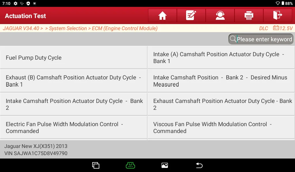 Actuate solenoids and actuators for active testing, send commands to systems/components to test their working status, without using the vehicle controls.