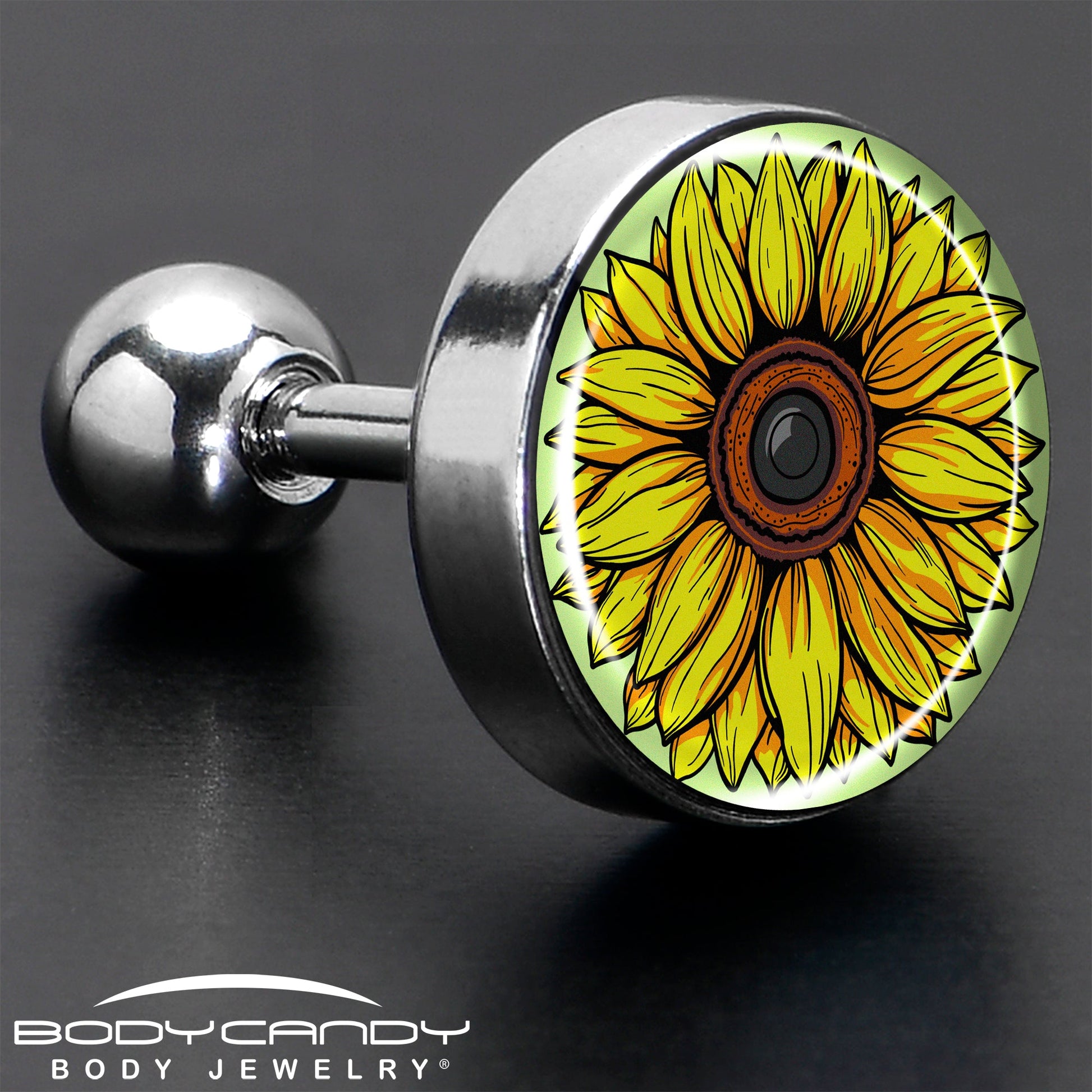 This 16 gauge artist hand drawn flower tongue jewelry is part of our new line of Blossom Creations body piercing jewelry for the season. This 6mm tragus stud is made with a 316L surgical grade stainless steel straight barbell with a 4mm ball end. It features a logo inlay charm with a bright yellow sunflower blooming to show off its brown center. You can even rock it in multiple piercings including tragus, helix, and some conch piercings. You'll be feeling stylish and sunny with this fabulously floral cartilage piercing jewelry.