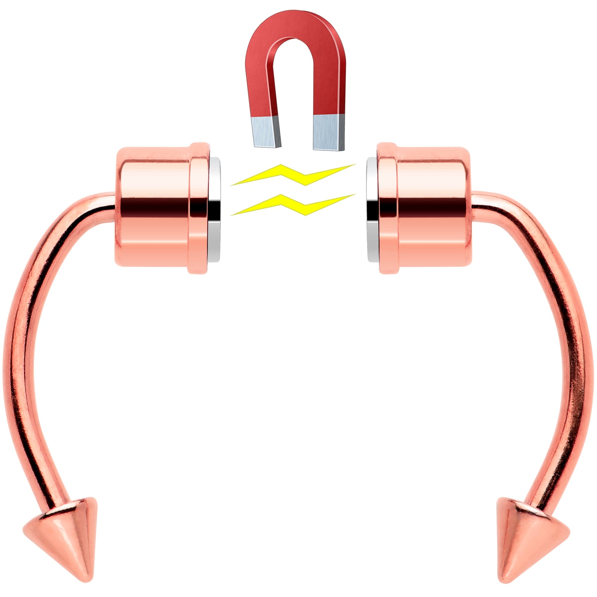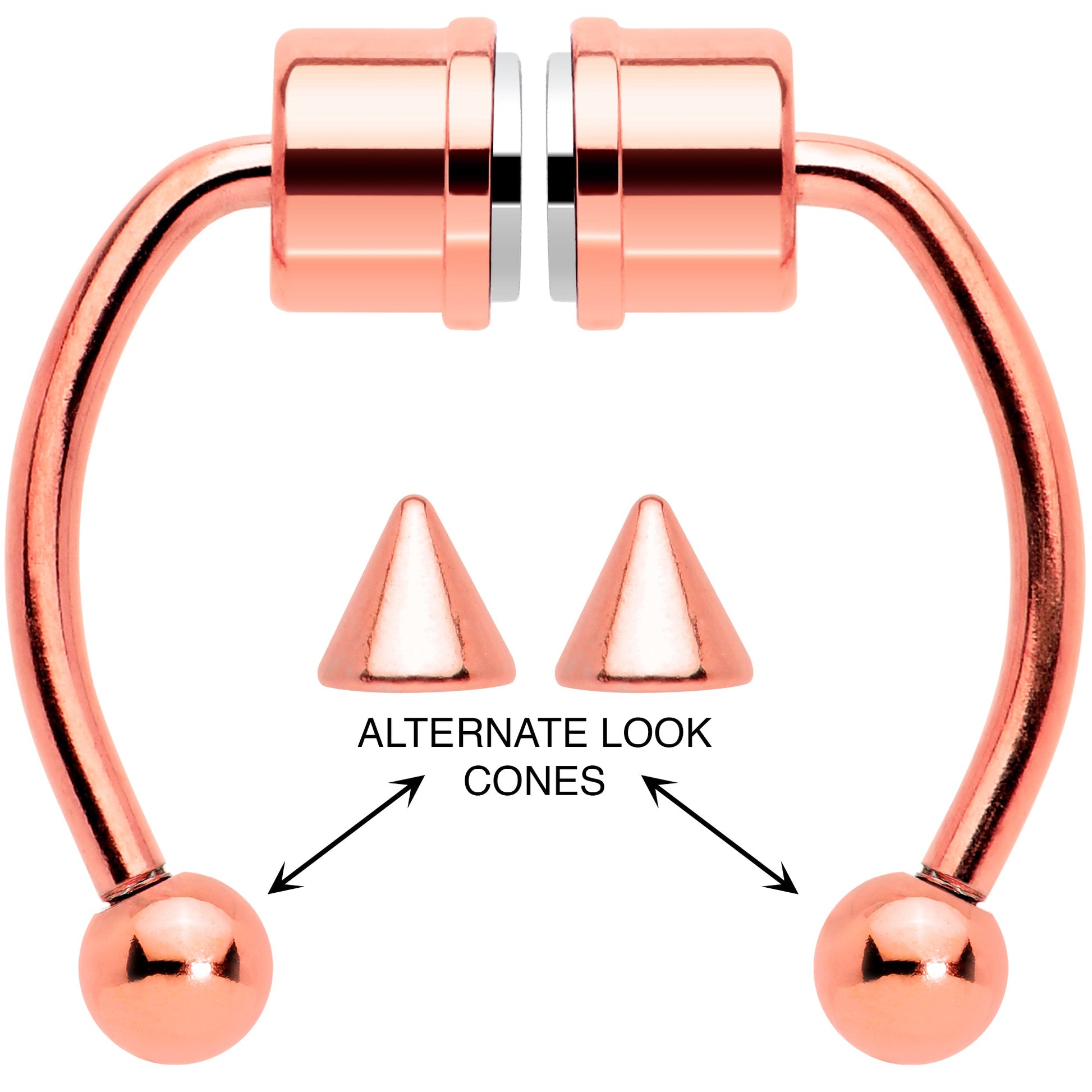 if you like the look but aren't ready to commit yet, this faux septum jewelry is perfect for you! It features a pair of magnets to hold it securely in place without the need of a trip to the piercer. It gives you a classic look that stands the test of time. Try out a new look before you commit with this magnetic faux septum jewelry! This fake septum nose ring set includes an extra set of stainless steel cone ends so you can easily change your look.