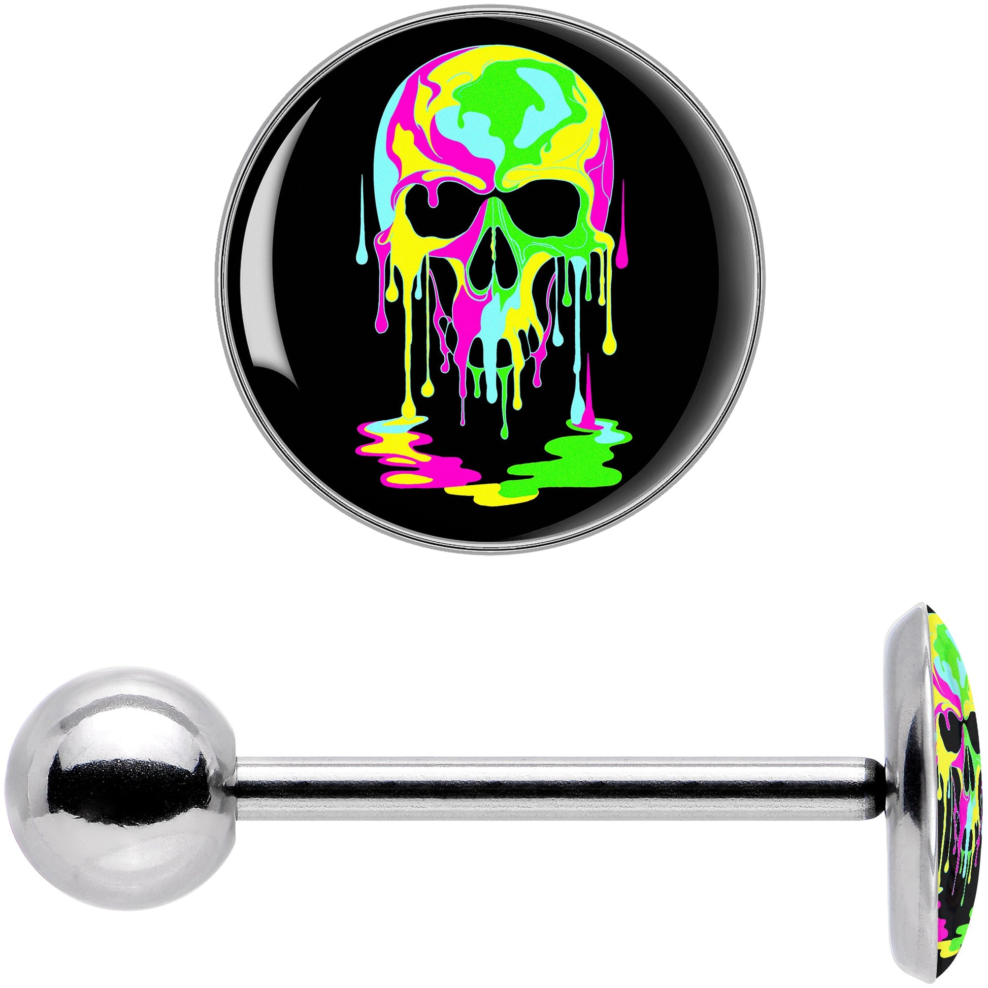 The multicolor skull on this 14 gauge tongue jewelry is so hot that it looks like it might be melting. The style will melt your face off when you are rocking this gorgeously gruesome tongue piercing ring.