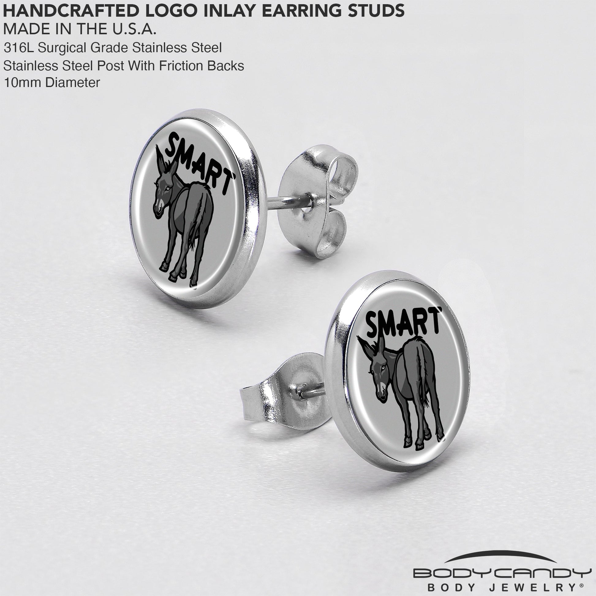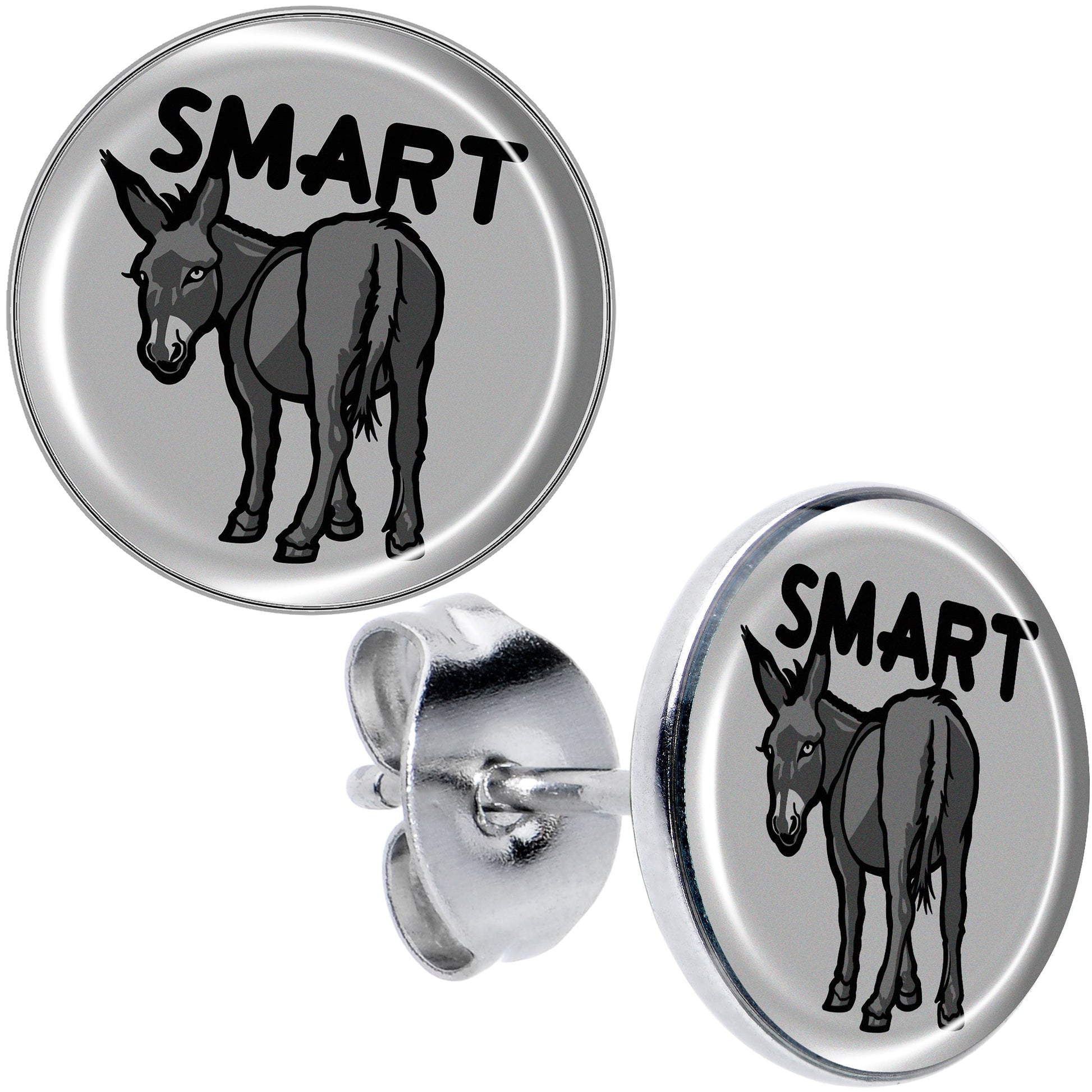 Give your look some sass with the smart ass on these stud earrings for pierced lobes. They're made with stainless steel straight posts with friction backs for a secure fit. Each one features a grey disc charm. One each one is a donkey with a the word "smart" over it, for a clever bit of wordplay that's sure to get some laughs. Get some smartass style with the delightful donkeys on these pierced earrings. Sold as a set of two.