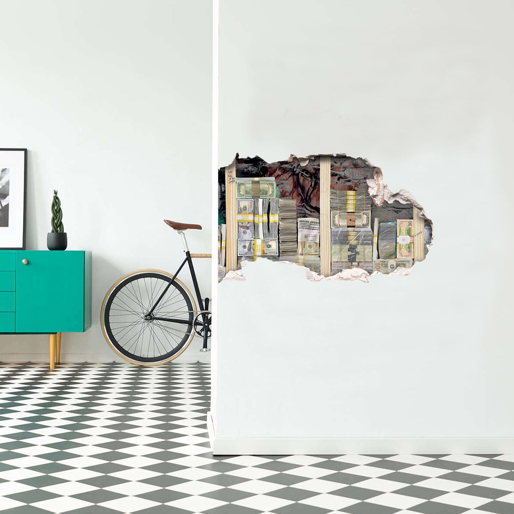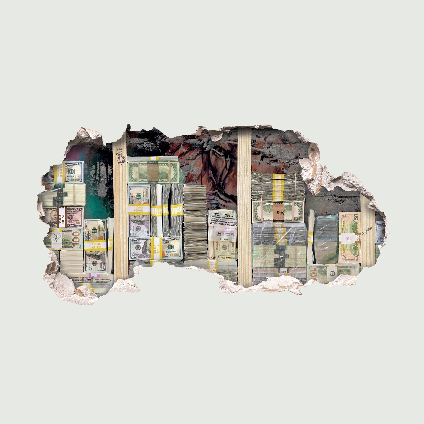 Unleash Your Inner Lion! Transform your space into a haven of motivation and inspiration with our Hustle Motivation Wall Decal. This high-quality matte laminated decal features a unique broken wall design adorned with realistic money stacks and a captivating graffiti lion in the background. Measuring 43" x 23", this decal is designed to make a bold statement in both home and office environments.