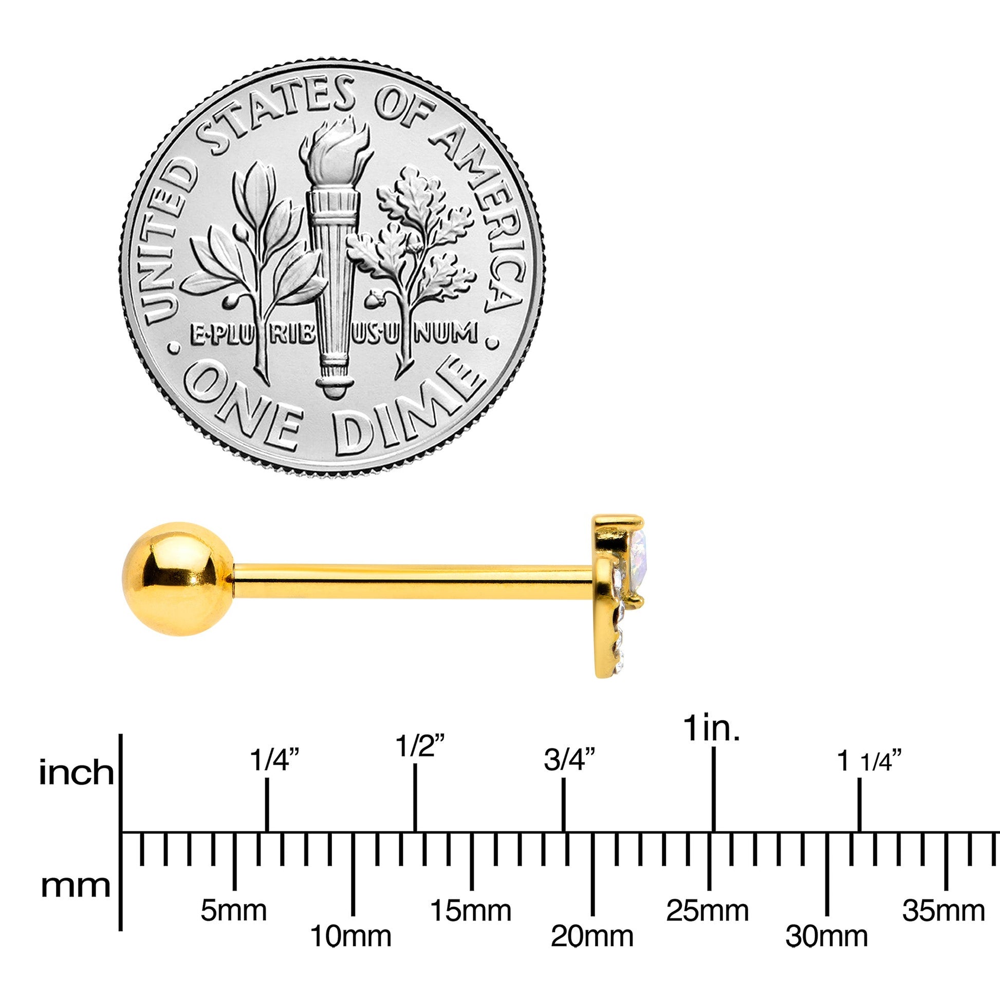 Look luxe and love it without breaking the bank with this 14 gauge tongue jewelry! It's made with a 5/8" gold tone PVD over 316L surgical grade stainless steel straight barbell with a 5mm bottom ball end. The top end features a heart charm, with one heart composed of a single aurora gem. It's set within a second heart, paved with clear cubic zirconia gems. You're going to fall in love with the opulent look of this heart-themed tongue piercing ring!