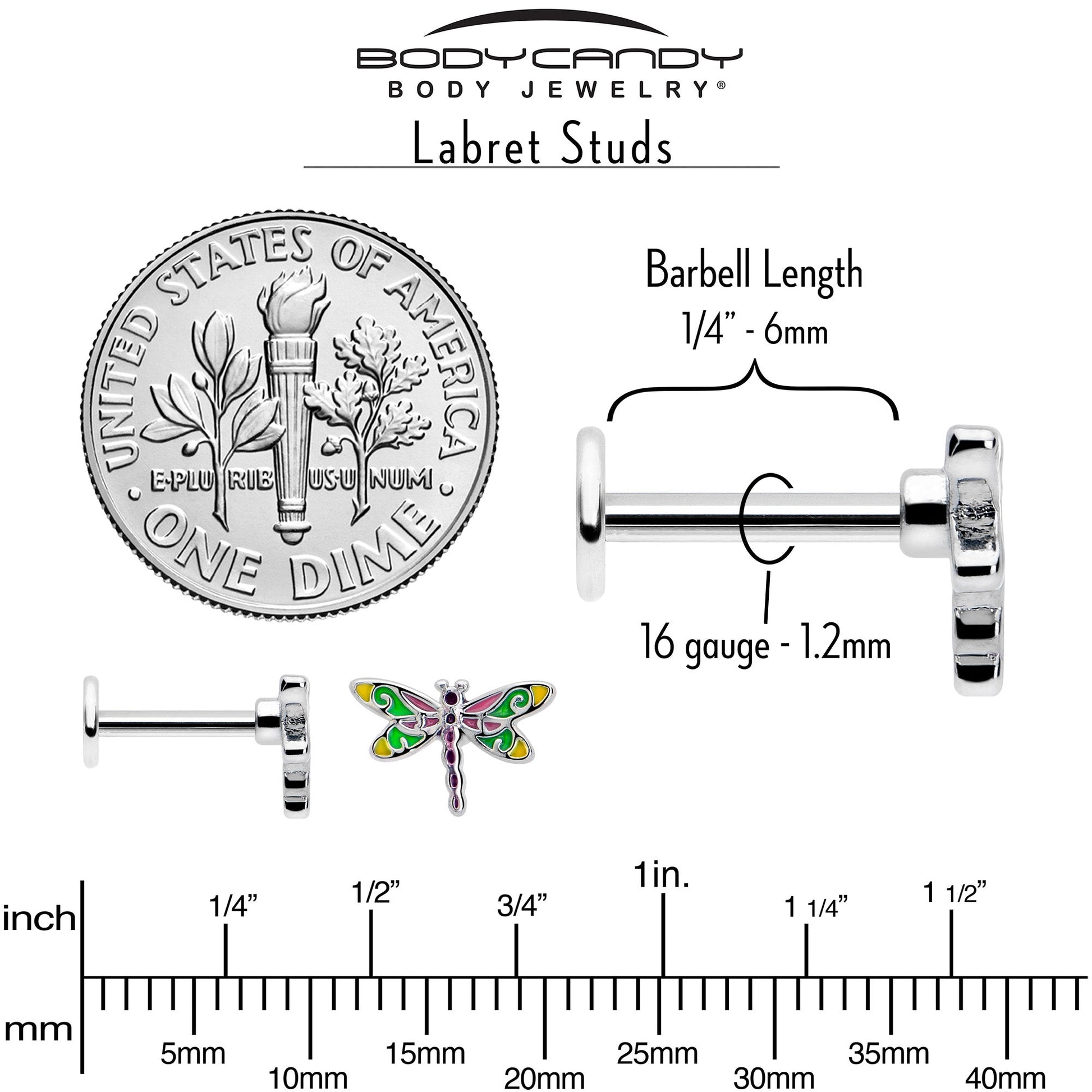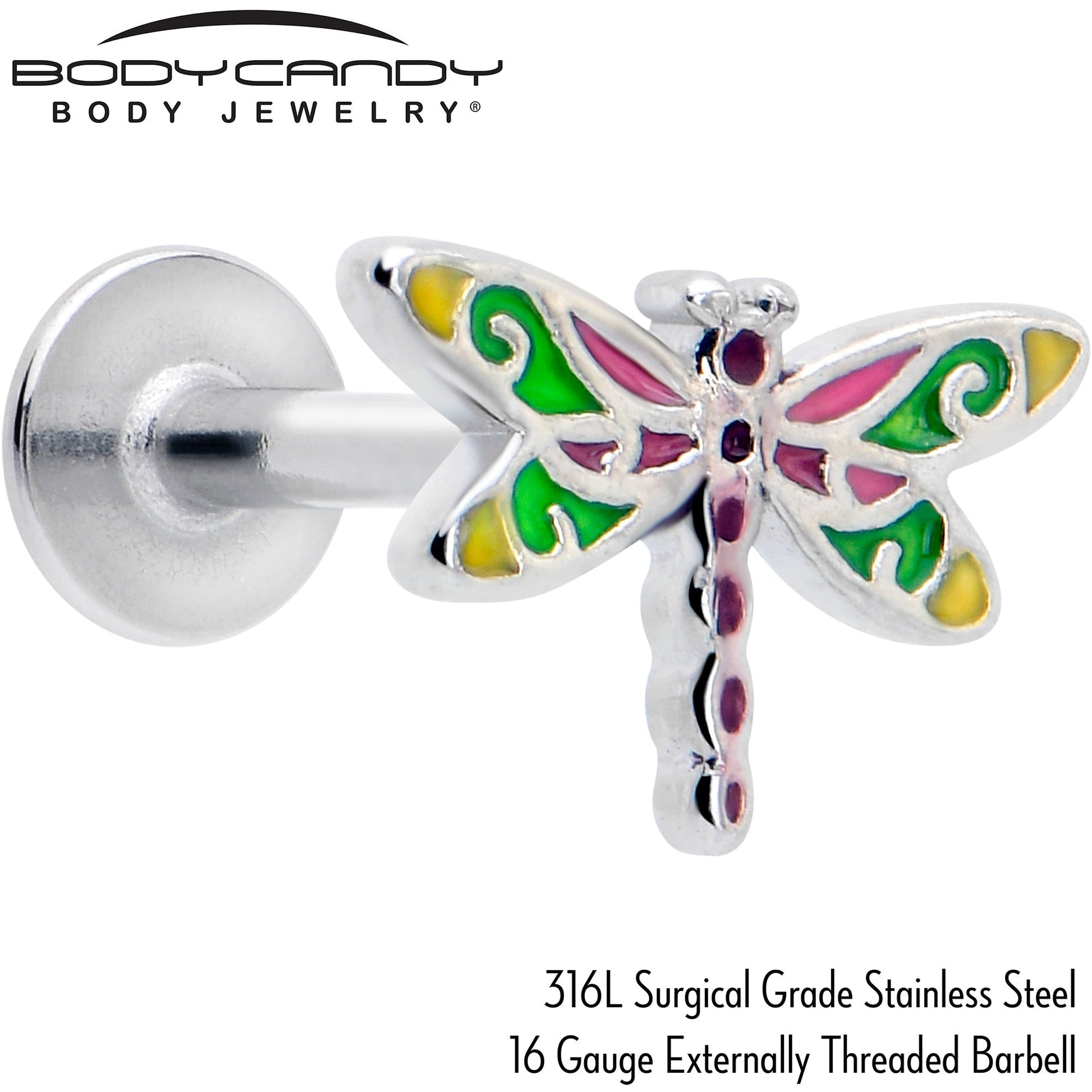 Check out this super comfortable 16 gauge flat back earring for 24/7 wear.. No need to take this earring out; keep it in for sleeping and naps. It's made with a durable 316L surgical grade stainless steel straight post with a flat disc end. The front end features a dragonfly charm, inlaid with green, yellow, pink and purple for a colorful look you can't miss. Spread your wings and take flight with this colorful dragonfly ear piercing jewelry..