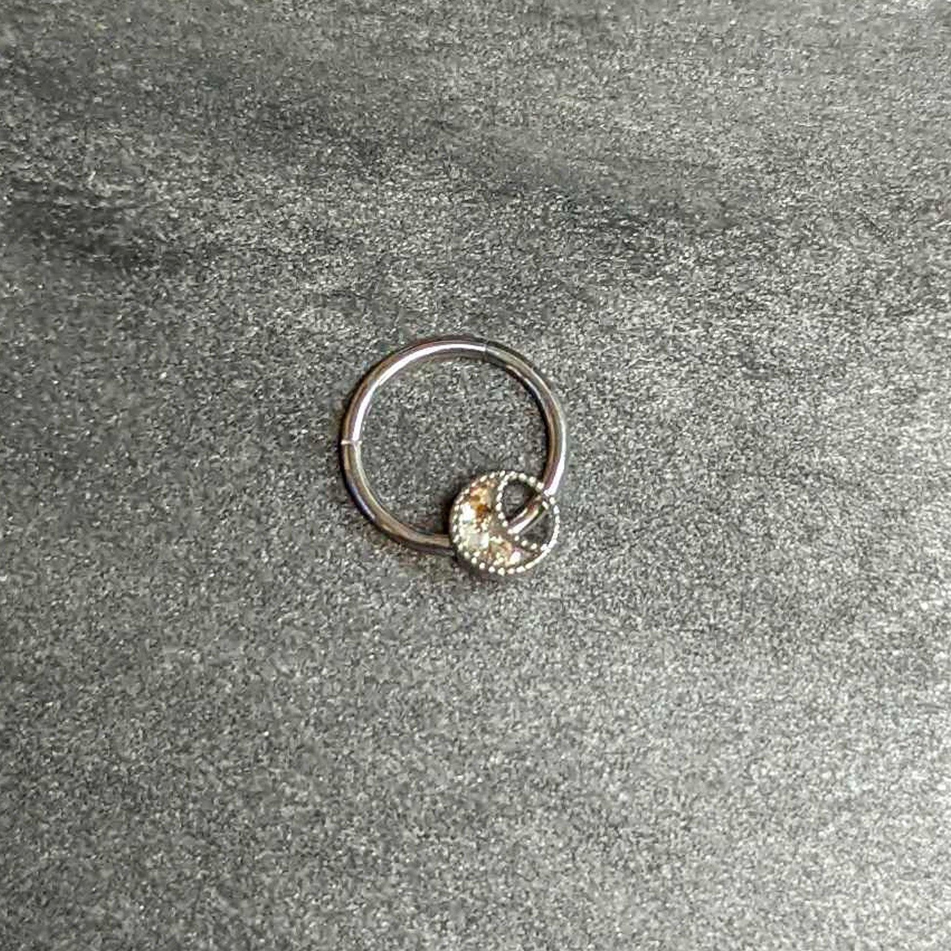 You're sure to love the luscious lunar look of this 16 gauge septum ring! It's made with a 10mm durable 316L surgical grade stainless steel hinged circular barbell. It features an iridescent, multicolor crescent moon charm which is completely rimmed with textured embellishment for an added touch of luxurious style. It also features a hinged, non-removable segment that makes insertion and removal a breeze and you can rock it in multiple piercings including tragus, helix, and some daith piercings. Let the moon stay out no matter what the hour, with this marvelous moon cartilage piercing ring!