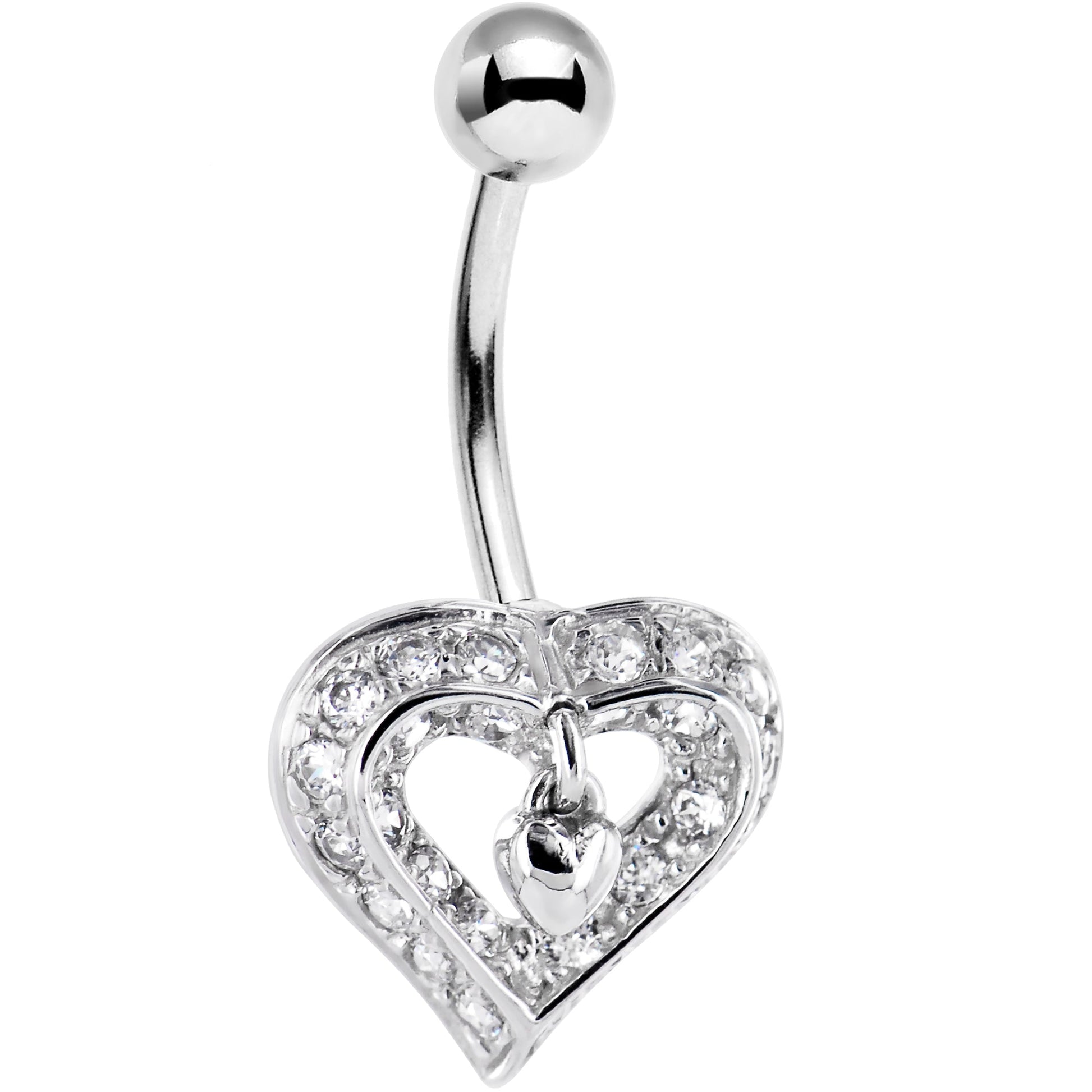 Enrich your Style with this Heart Belly Ring designed with sparkling Cubic Zirconia's and an adorable Gold Heart charm in the center of the Hollow Heart. Solid Gold Body Jewelry.
