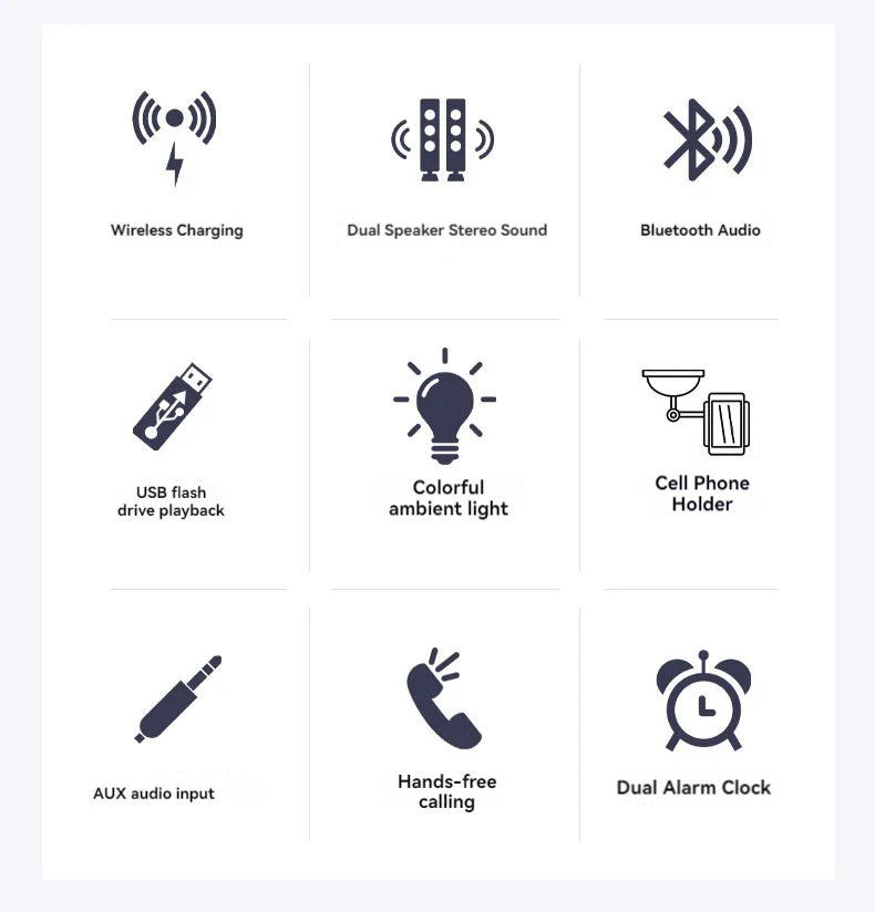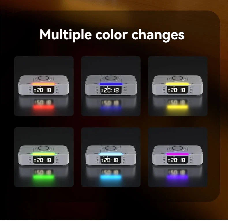Portable Bluetooth Speaker with Wireless Charging Atmosphere Light Clock Alarm Function Double Speaker USB Charging